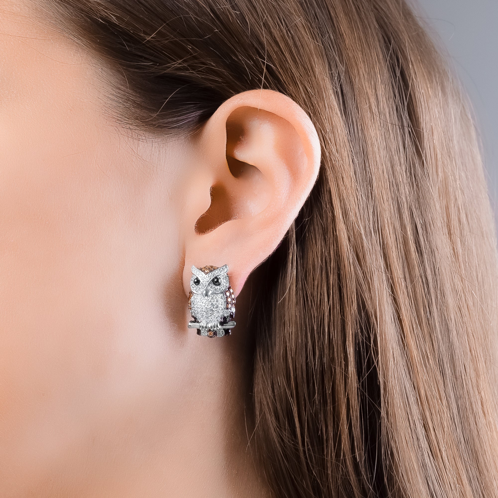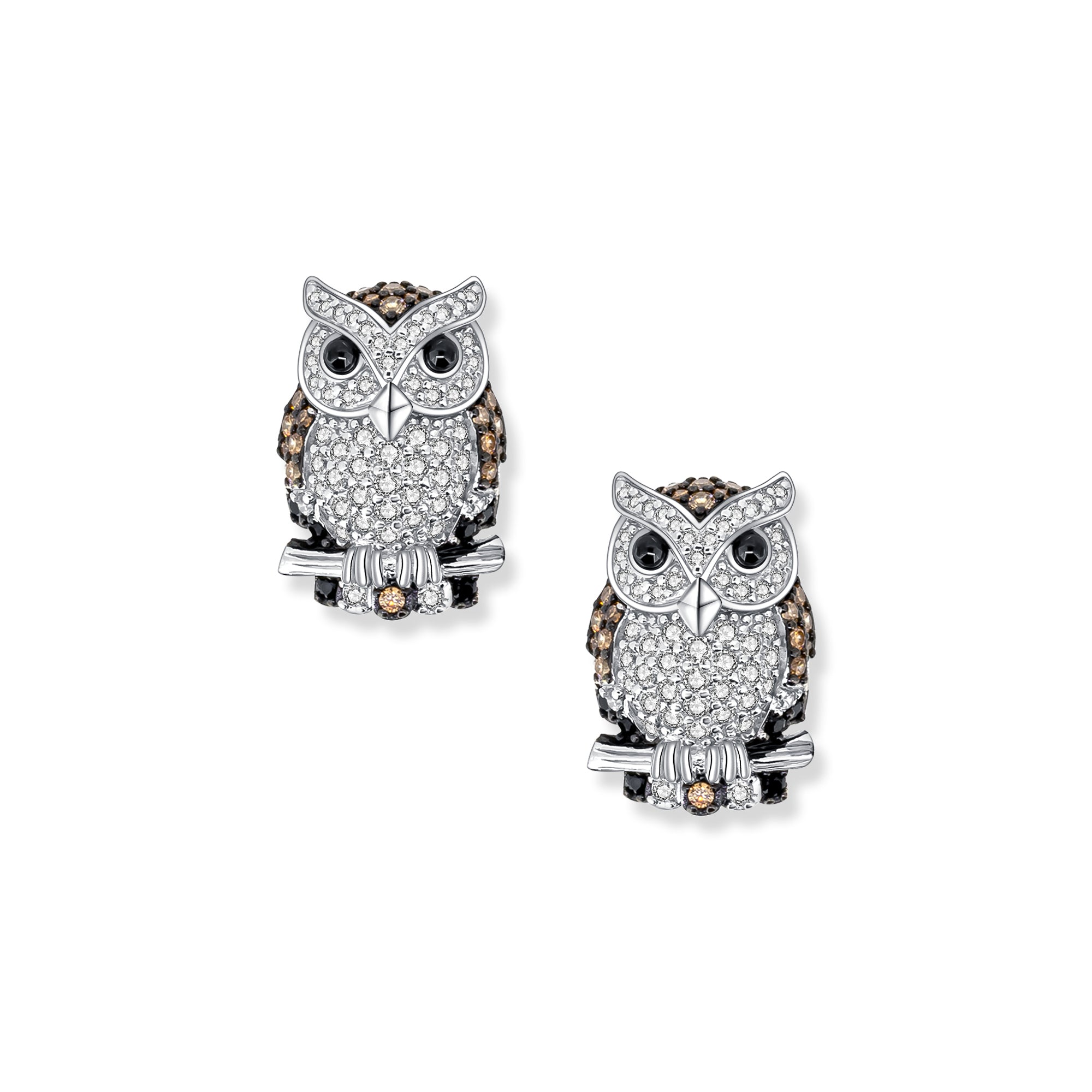 The Arno Owl Earrings made of 925 sterling silver are adorned with sparkling zirconia stones in brown and white. The owls gracefully perch on branches, adding a natural elegance to your look.