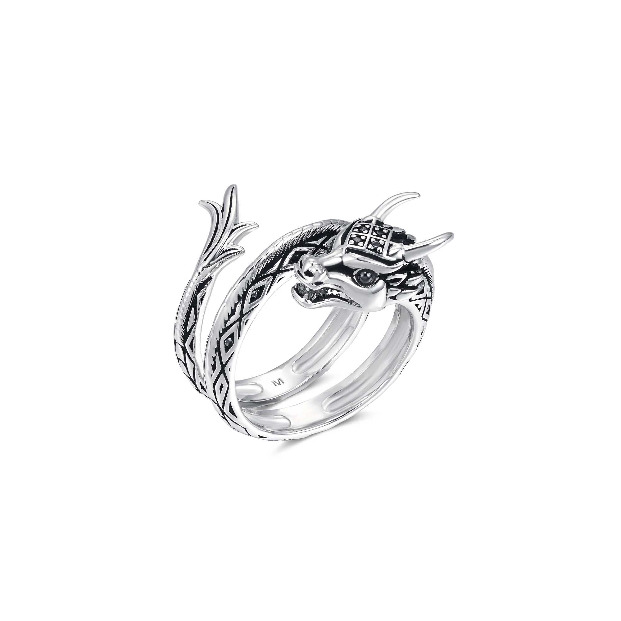 The Drakonis Dragon Ring made of sterling silver, featuring a double-curved band and complete texture over the entire dragon body, is an impressive free-size statement piece from the SEINERZEIT Noctis collection.