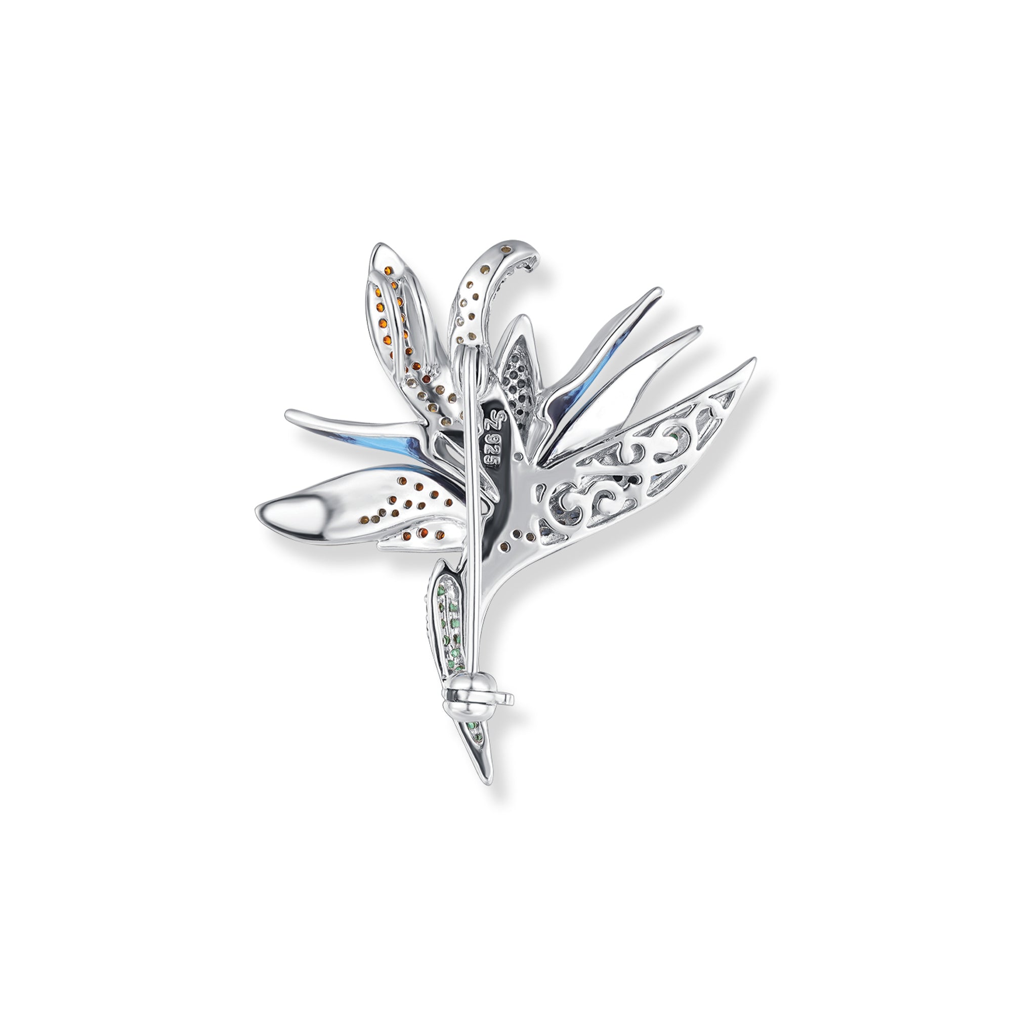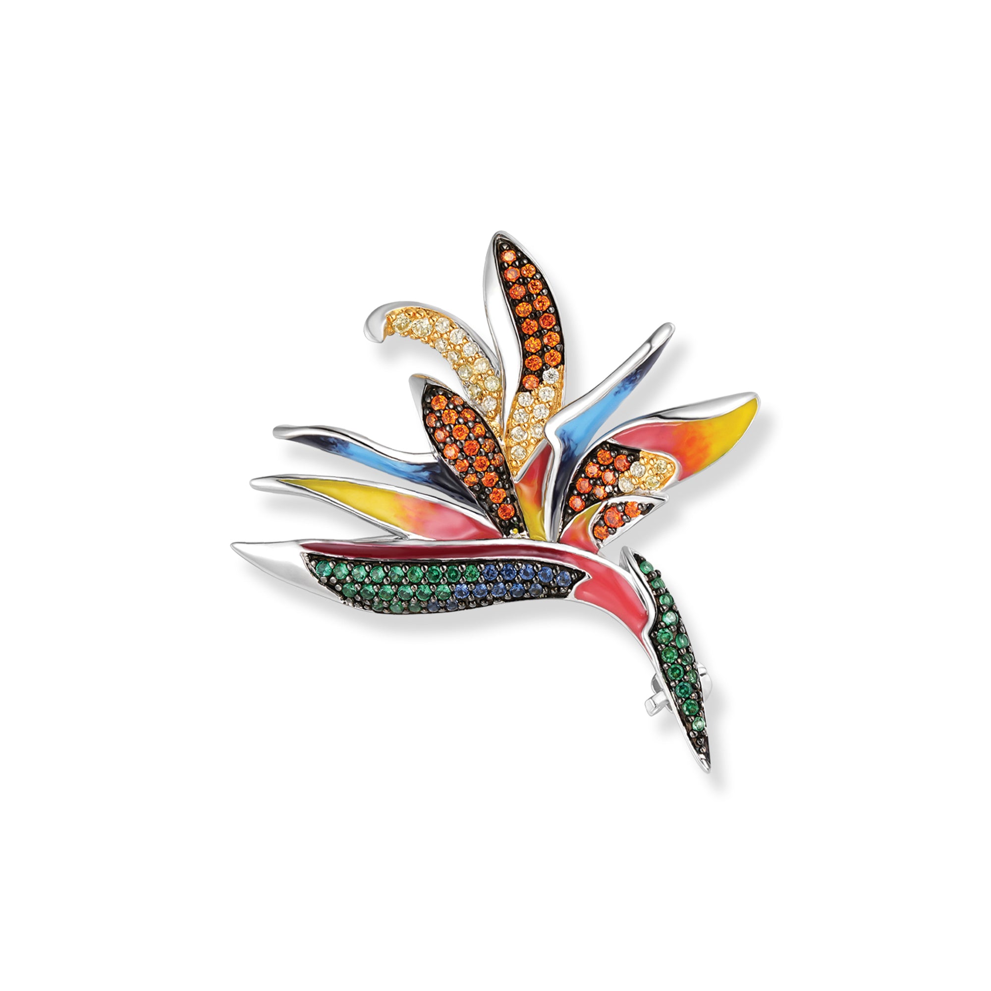 The rhodium-plated Eden flower pendant/brooch made of 925 silver, adorned with colorful zirconia and colored enamel, combines elegance and vibrant freshness in a unique piece of jewelry.