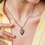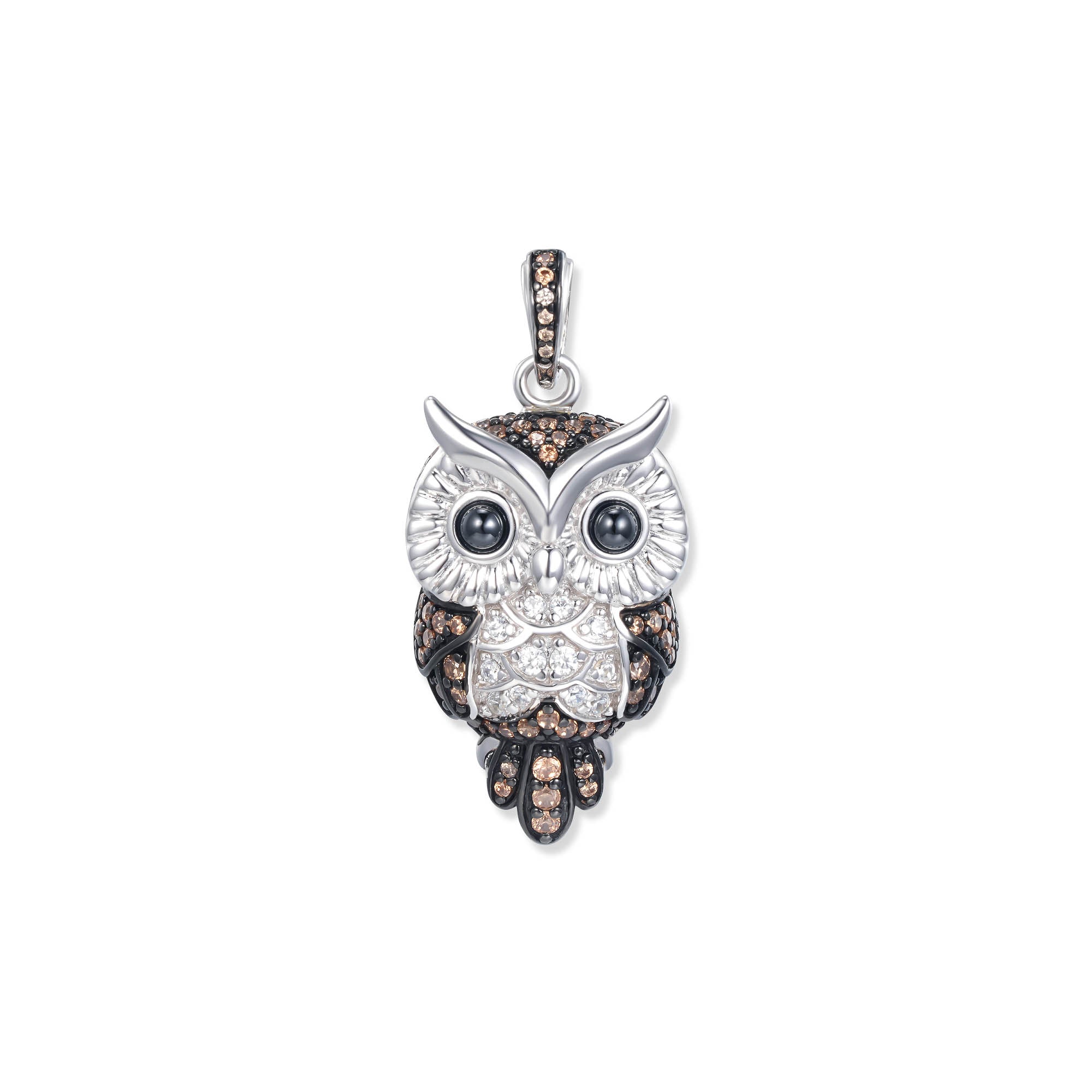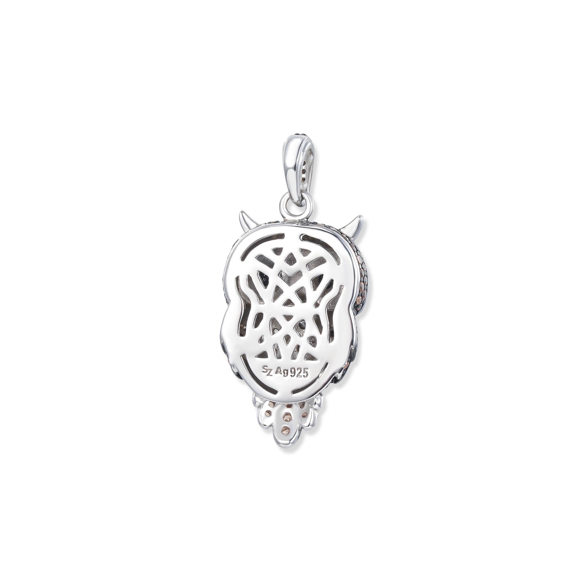 Discover the Merlin owl pendant made of high-quality sterling silver, artistically adorned with champagne-colored zirconia, capturing the timeless wisdom and beauty of the owl in a luxurious piece of jewelry. Perfect for animal lovers and fans of elegant designs.