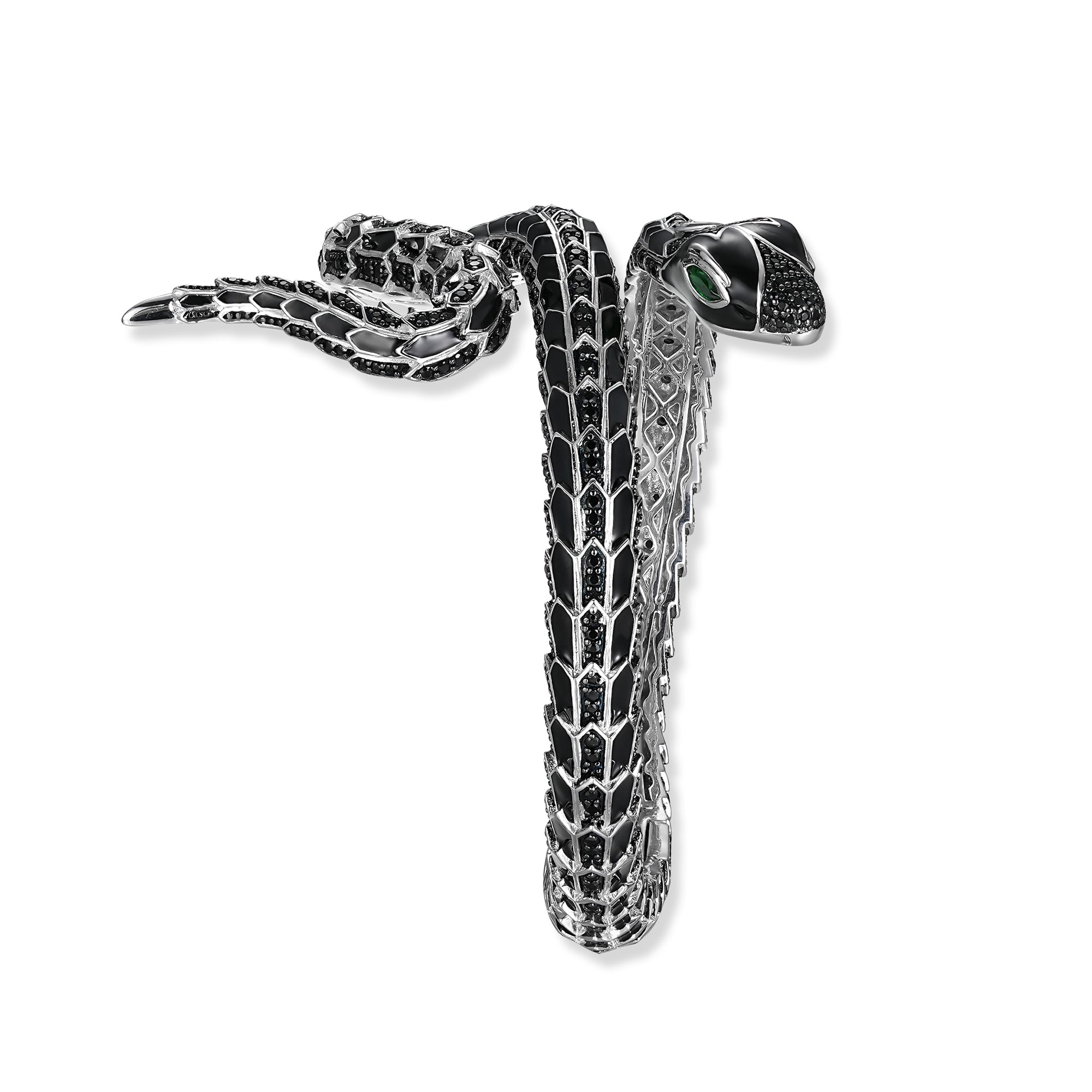 The Eragon Snake Arm Cuff, crafted from finest 925 sterling silver and expertly rhodium-plated, is a true masterpiece of jewelry art. Adorned with black zirconia, the detailed scales resemble those of a dragon. The deep black elegance and the emerald green zirconia eyes in marquise cut make this cuff an exquisite statement piece. The snake coils menacingly around the wrist, gazing majestically along the back of the hand.