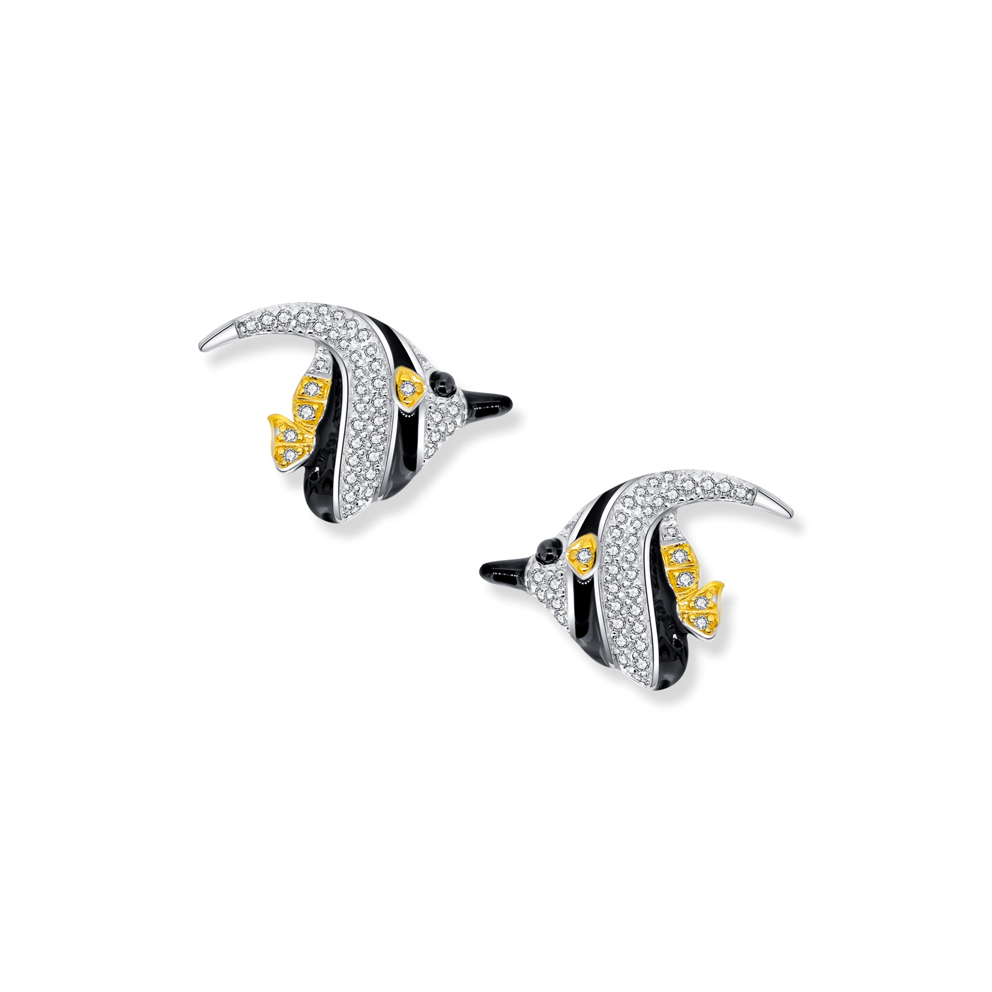 The Ozy Fish Earrings are an artistic masterpiece that captures the beauty of the ocean. Made from high-quality 925 sterling silver, the earrings are enamelled, rhodium-plated, blackened, and gold-plated. The sparkling black and white zirconia stones give these earrings a radiant elegance.
