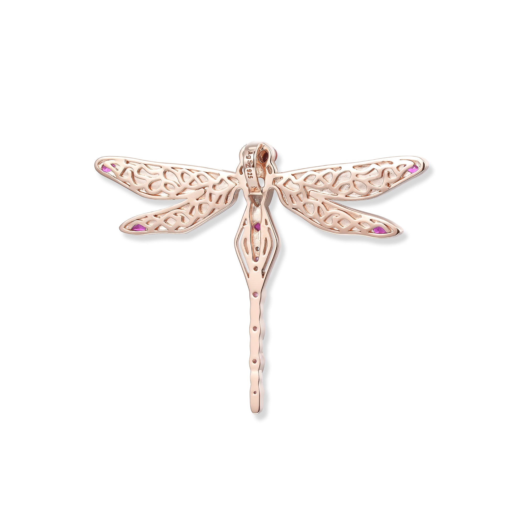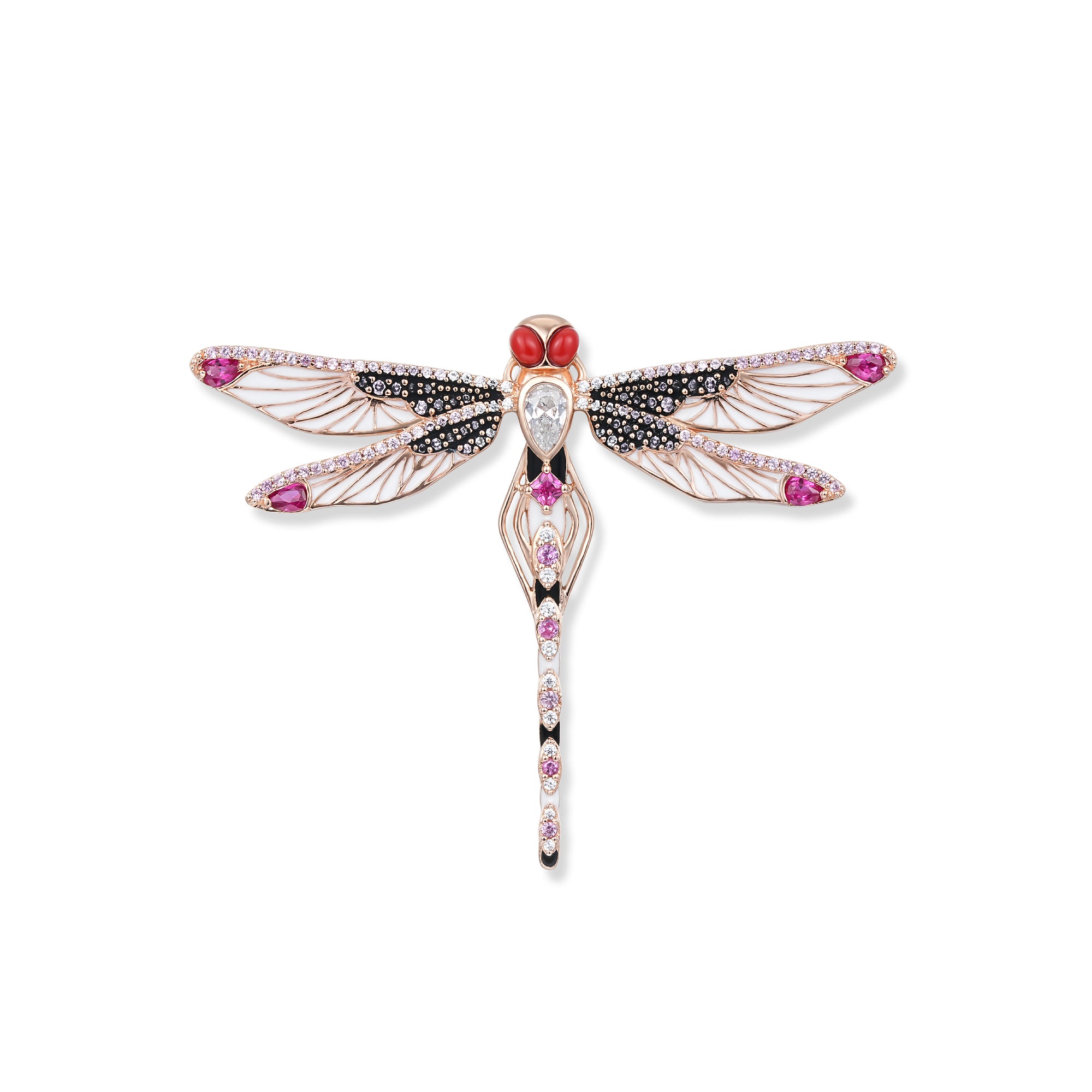 Nella – die rosévergoldete Libelle mit weißer Emaille, dunklen Zirkonia, fuchsiafarbenen Akzenten und korallenfarbenen Augen. Ausdrucksstark. Elegant. SEINERZEIT Waldleben.