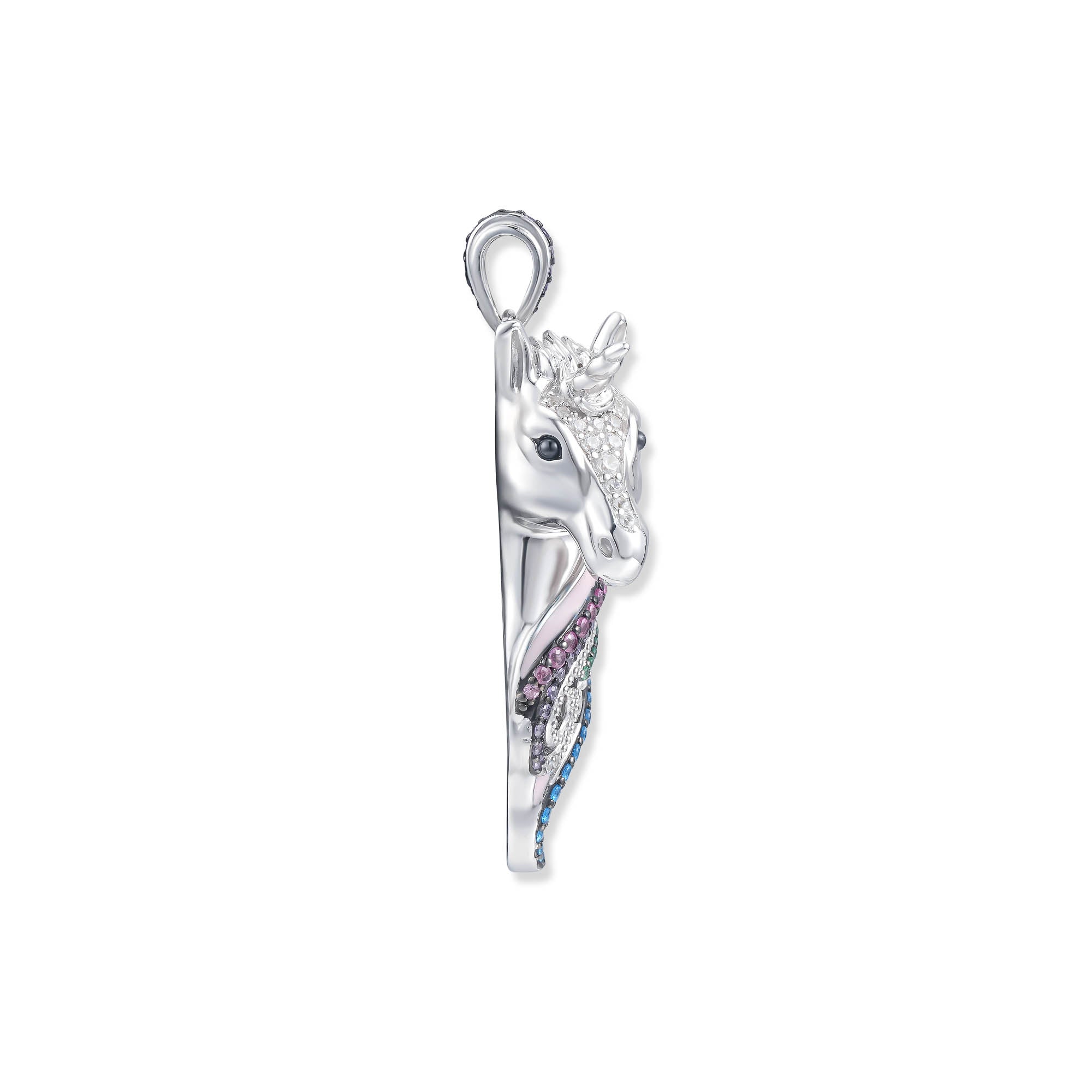 The Aurelia Unicorn Pendant in the shape of a delicate unicorn head made of sterling silver, adorned with pink, purple, and colorful zirconia, is a magical piece of jewelry from the SEINERZEIT Dream Collection.