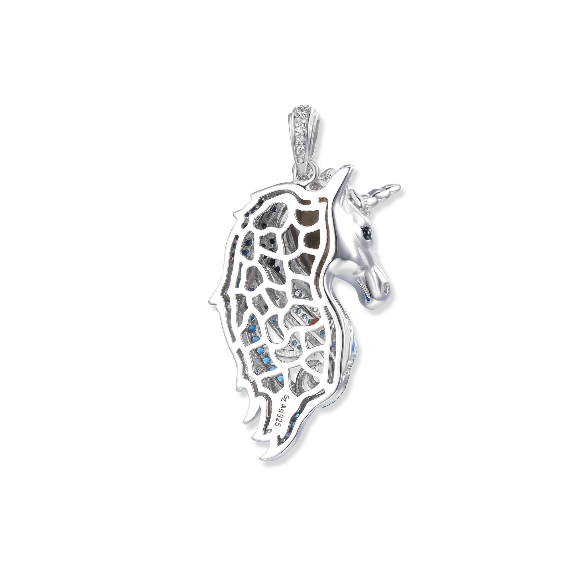 The Azura Unicorn Pendant made of sterling silver, shaped like a delicate unicorn head and adorned with blue and multicolored zirconia, is a dreamy piece of jewelry from the SEINERZEIT Dream Collection.