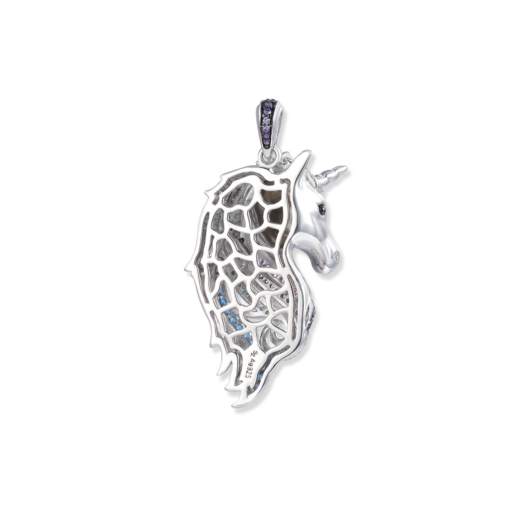 Der Aurelia Einhorn Anhänger in Form eines filigranen Einhornkopfes aus Sterling Silber, verziert mit rosa, lila und bunten Zirkonia, ist ein magisches Schmuckstück aus der SEINERZEIT Dream Kollektion.