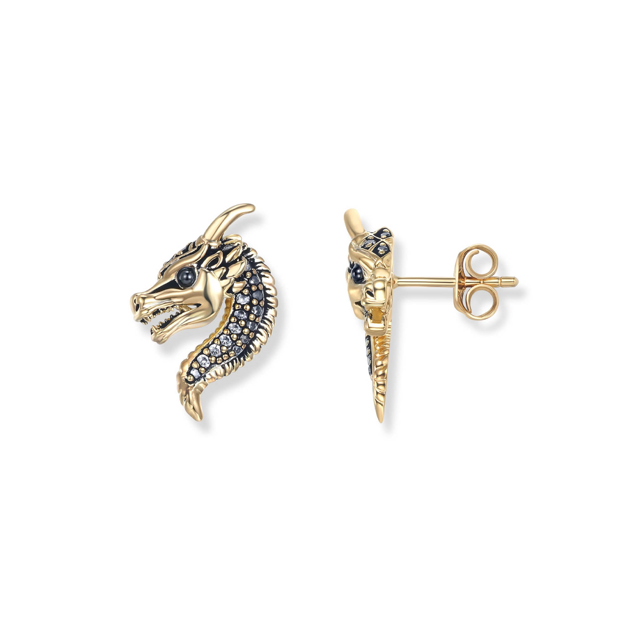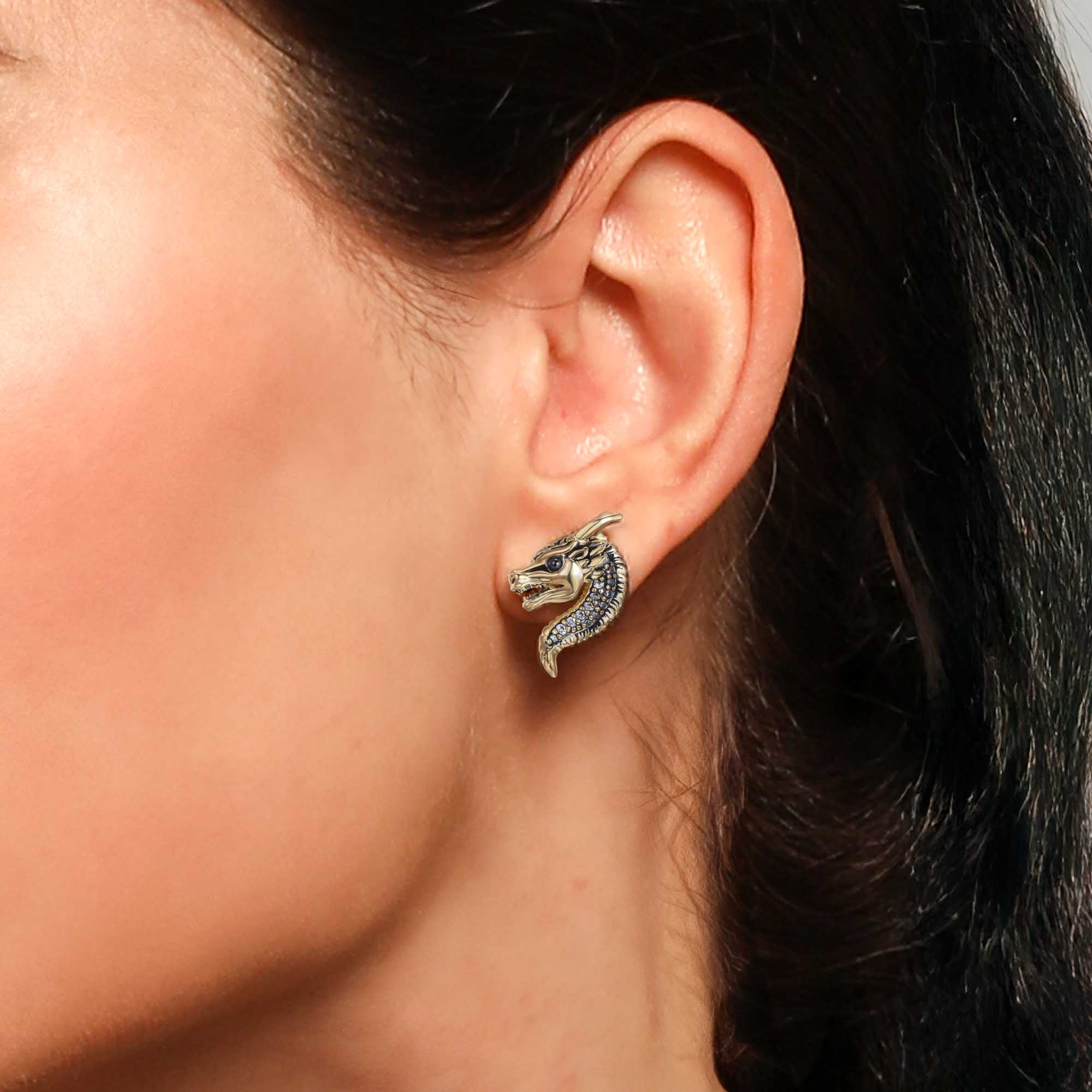 Die Belarius Drachen Ohrstecker aus 18k vergoldetem Sterling Silber, verziert mit schwarzen Zirkonia, sind ein kraftvolles und elegantes Accessoire aus der SEINERZEIT Noctis Kollektion – Unisex und mystisch zugleich.