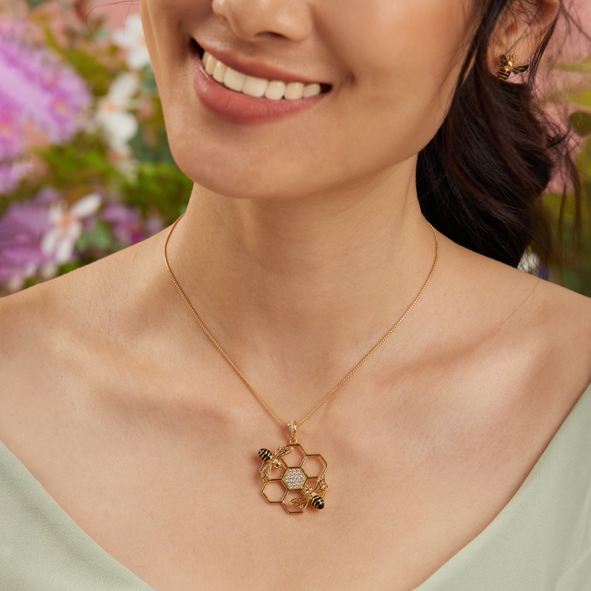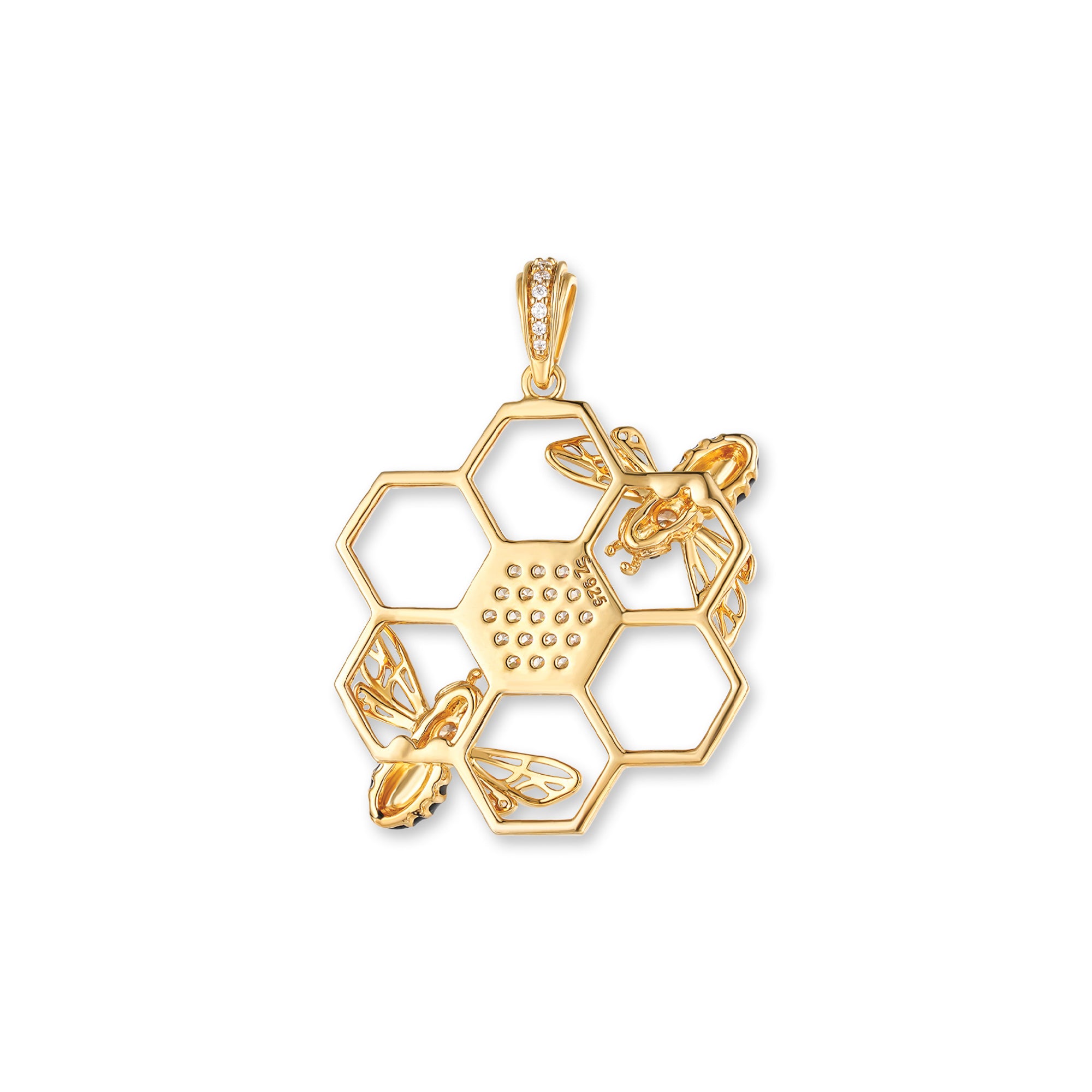 Bommel Bienen Anhänger, gefertigt aus feinstem Sterling Silber und mit einer verführerischen 18K Vergoldung, präsentiert eine bezaubernde Darstellung des Bienenreichs. Die Anhängerform zeigt eine Bienenwabe, auf der zwei gegenüberliegende Bienen platziert sind. Die zentrale Wabe wird von funkelnden Zirkonia verziert, und dieses kunstvolle Schmuckstück stellt eine honigsüße Ästhetik des Bienenvolkes dar.