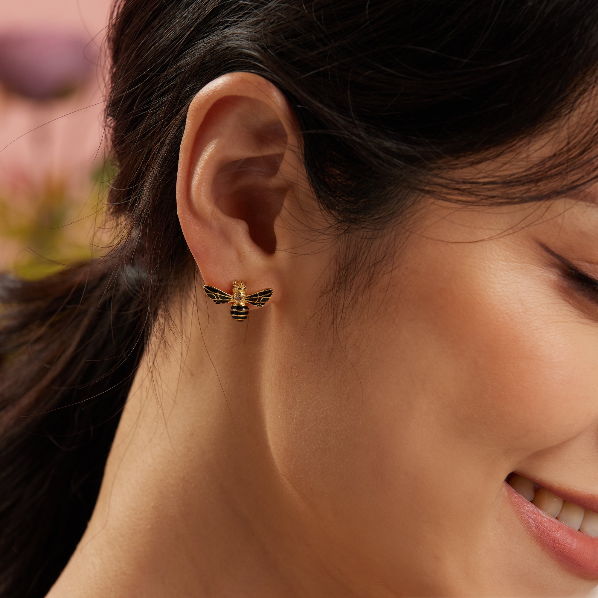 Bommel Bienen Ohrringe, aus feinstem 925 Sterling Silber gefertigt und mit einer entzückenden 18K Vergoldung veredelt, präsentieren kleine Bienenstecker mit schwarzer Emaille auf den Flügeln. Ein bezauberndes Duo für Naturliebhaber und Ästheten gleichermaßen.