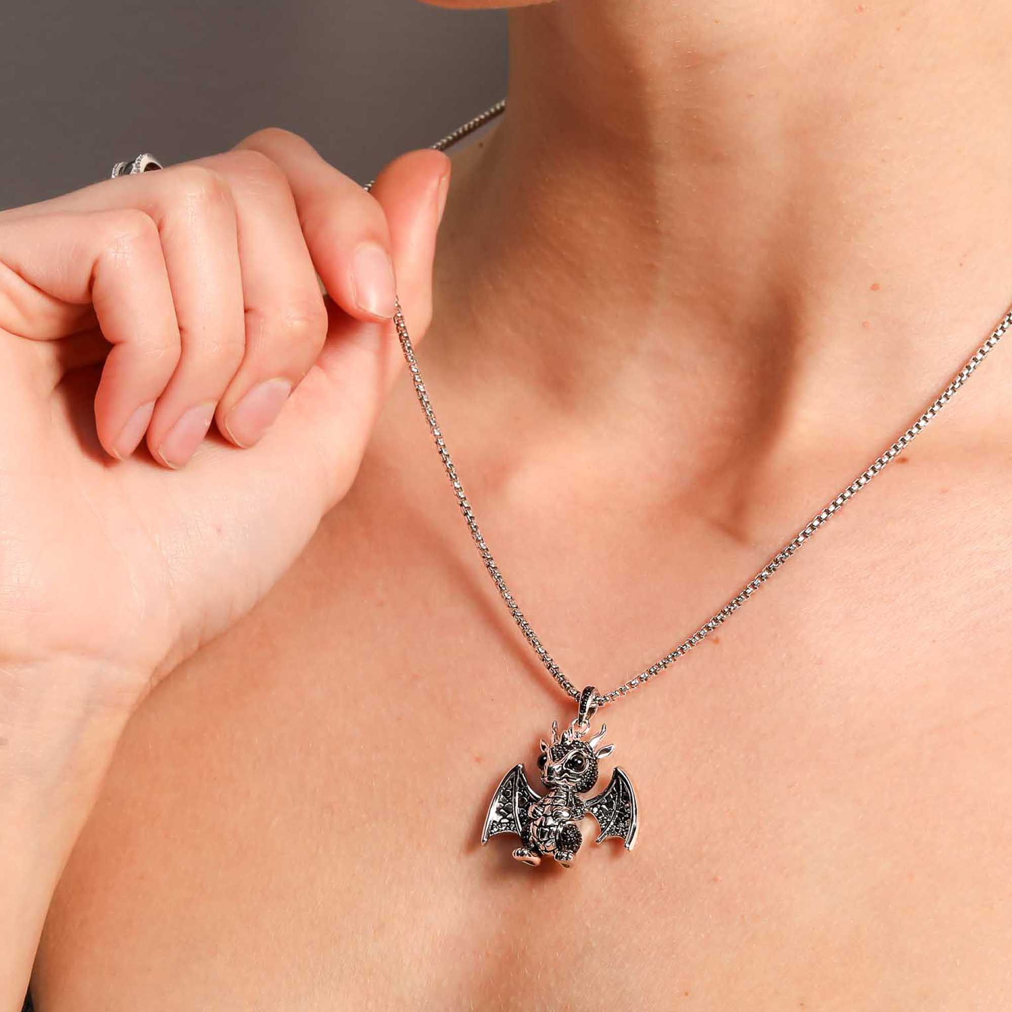 Der Draky Drachen Anhänger aus Sterling Silber mit schwarzer Rhodium-Beschichtung und funkelnden schwarzen Zirkonia zeigt einen niedlichen Babydrachen und kombiniert verspielten Charme mit mystischer Eleganz.