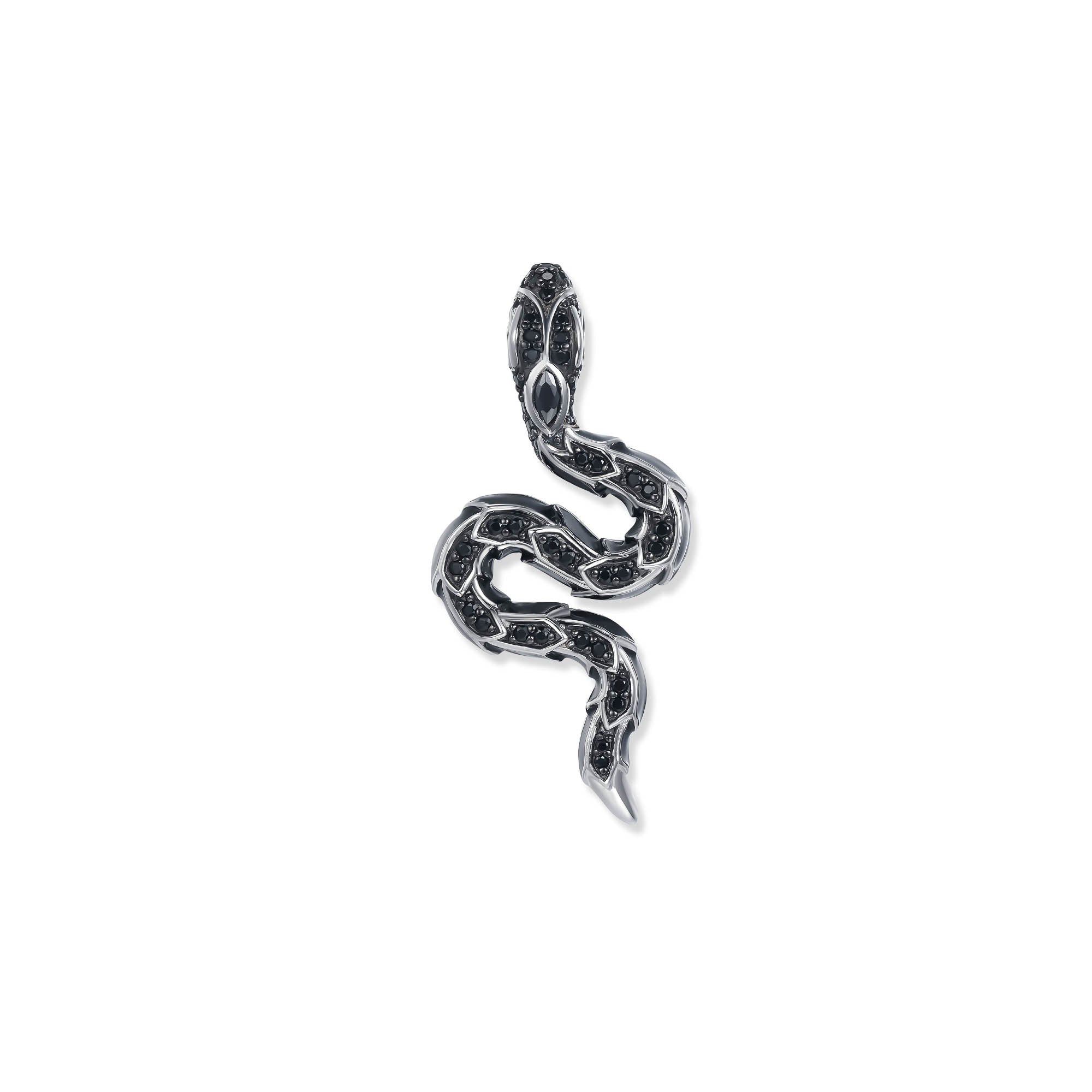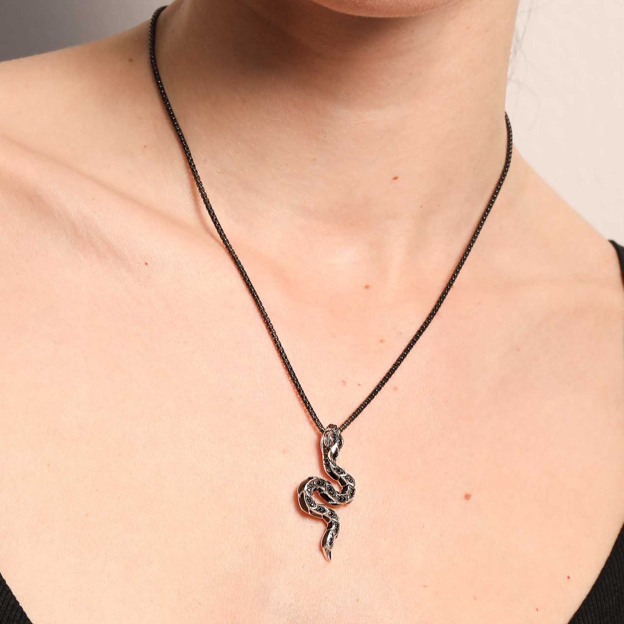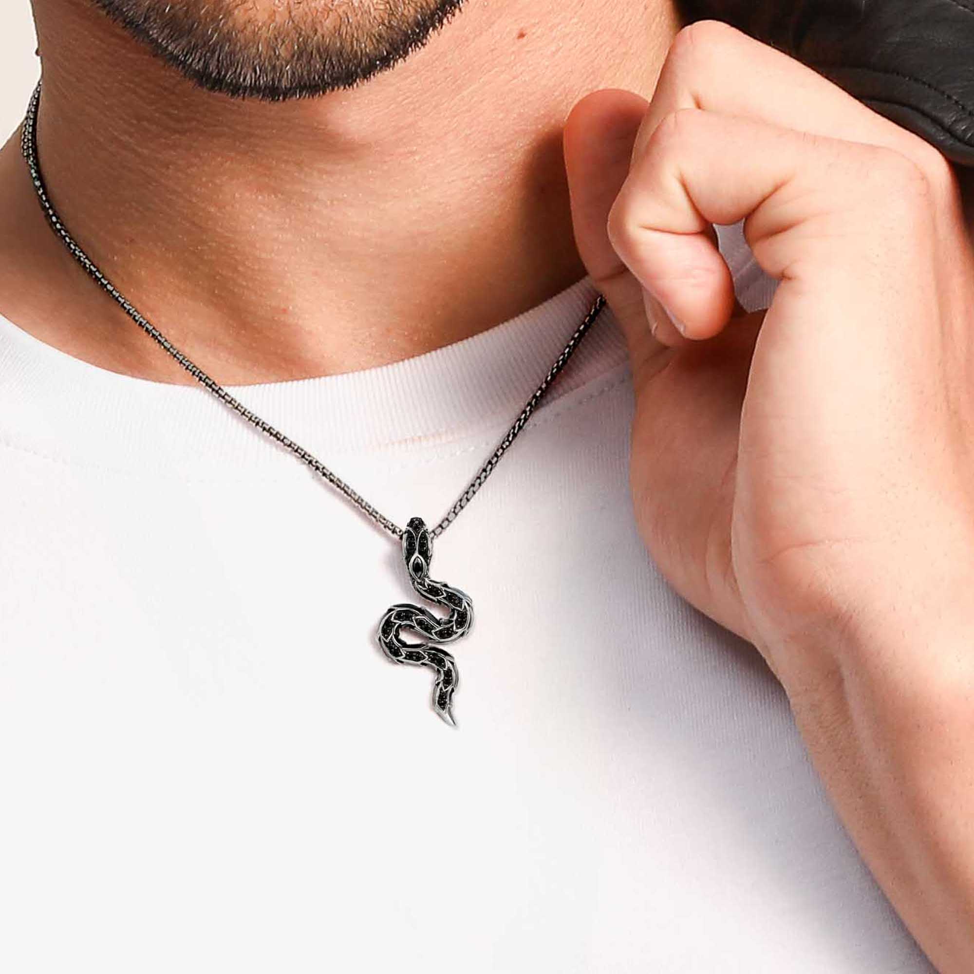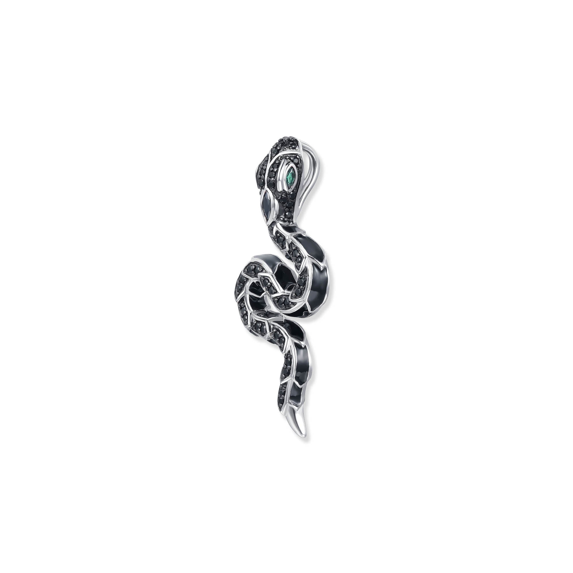 Der Eragon Schlangen Anhänger aus Sterling Silber mit smaragdgrünen Zirkonia-Augen, schwarzer Emaille, schwarzen Zirkonia und drachenschuppenartigen Texturen ist ein mystisches Unisex-Schmuckstück aus der SEINERZEIT Noctis Kollektion.