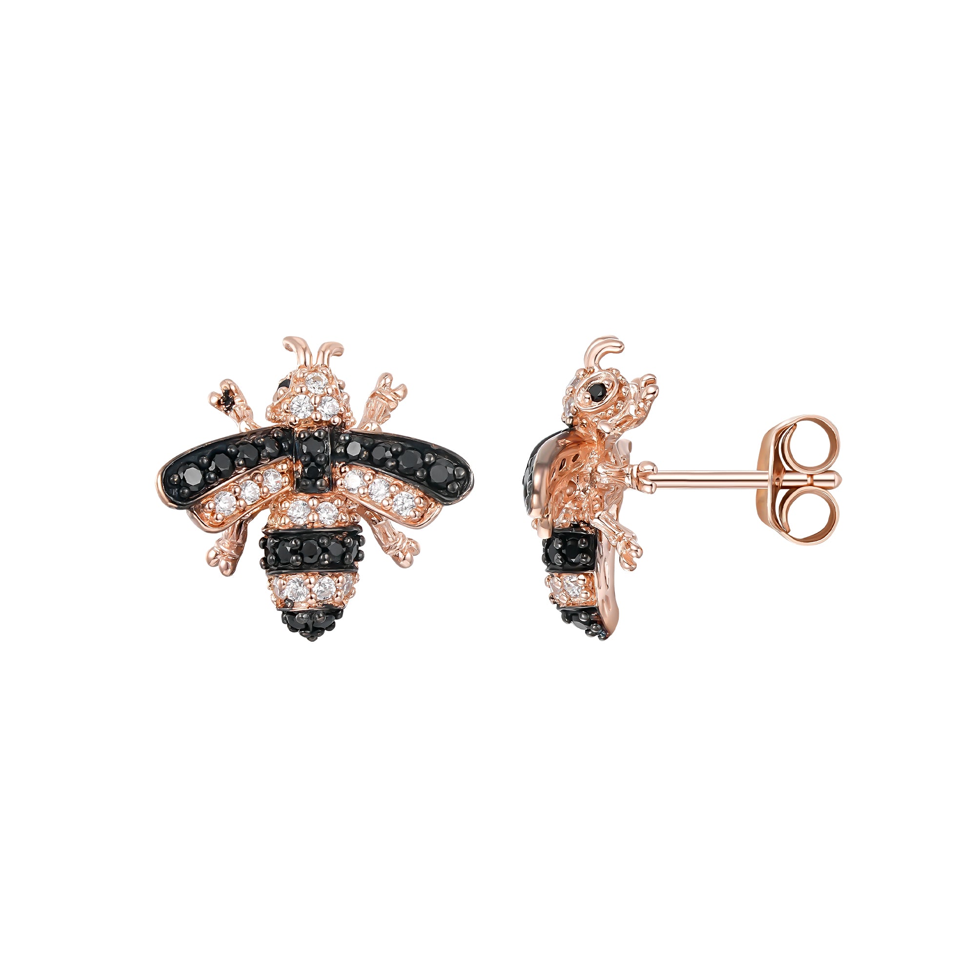 Filigrane Mini-Bienen in 18K Rosévergoldung mit schwarzen Zirkonia – die Misty Ohrstecker sind elegante Begleiter zur gleichnamigen Biene aus der SEINERZEIT Waldleben Kollektion.
