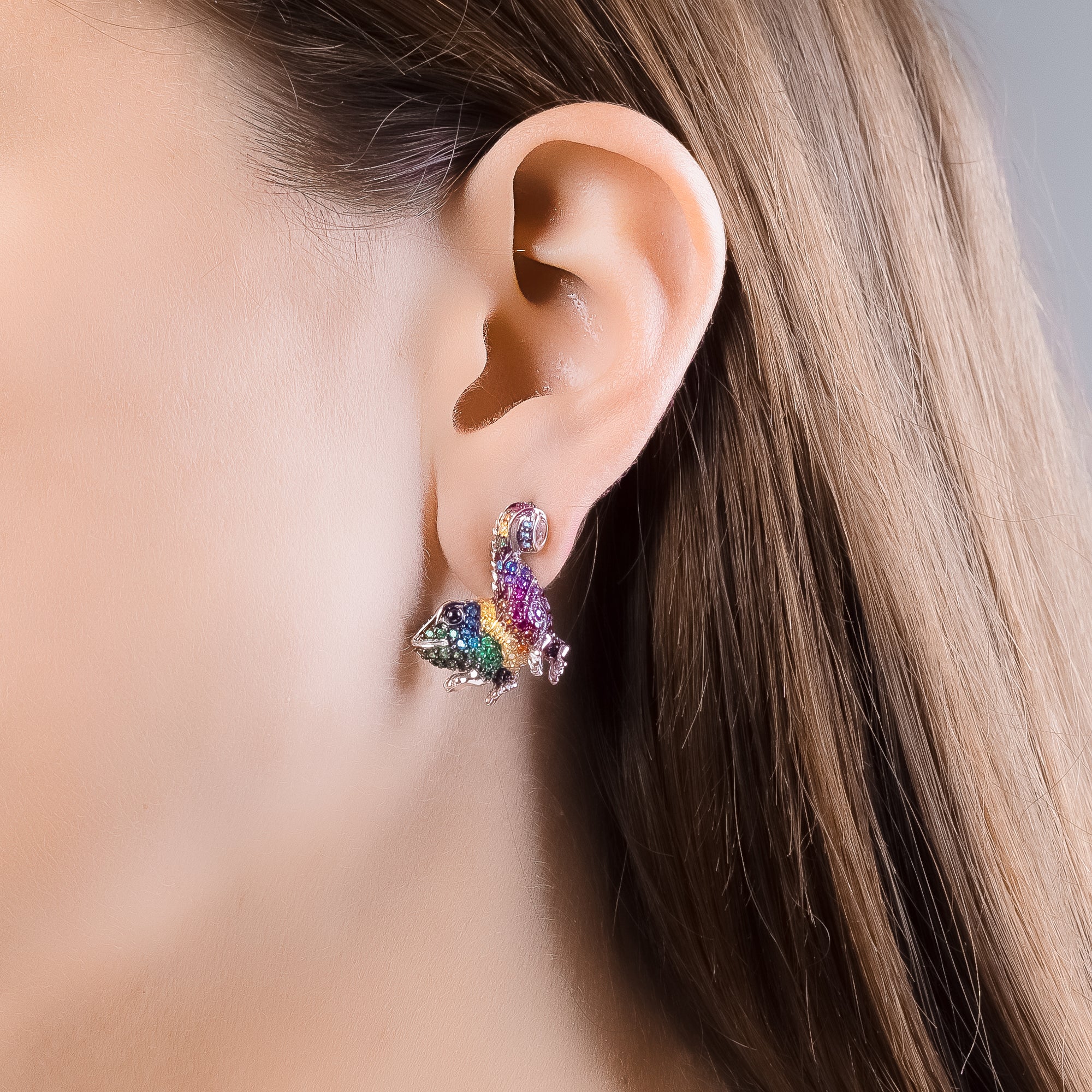 Die Theo Chamäleon Ohrringe aus 925 Sterling Silber sind ein Fest der Farben. Rhodiniert, geschwärzt und vergoldet, schmücken funkelnde Zirkonia Steine in verschiedenen Farben diese eleganten Ohrringe.