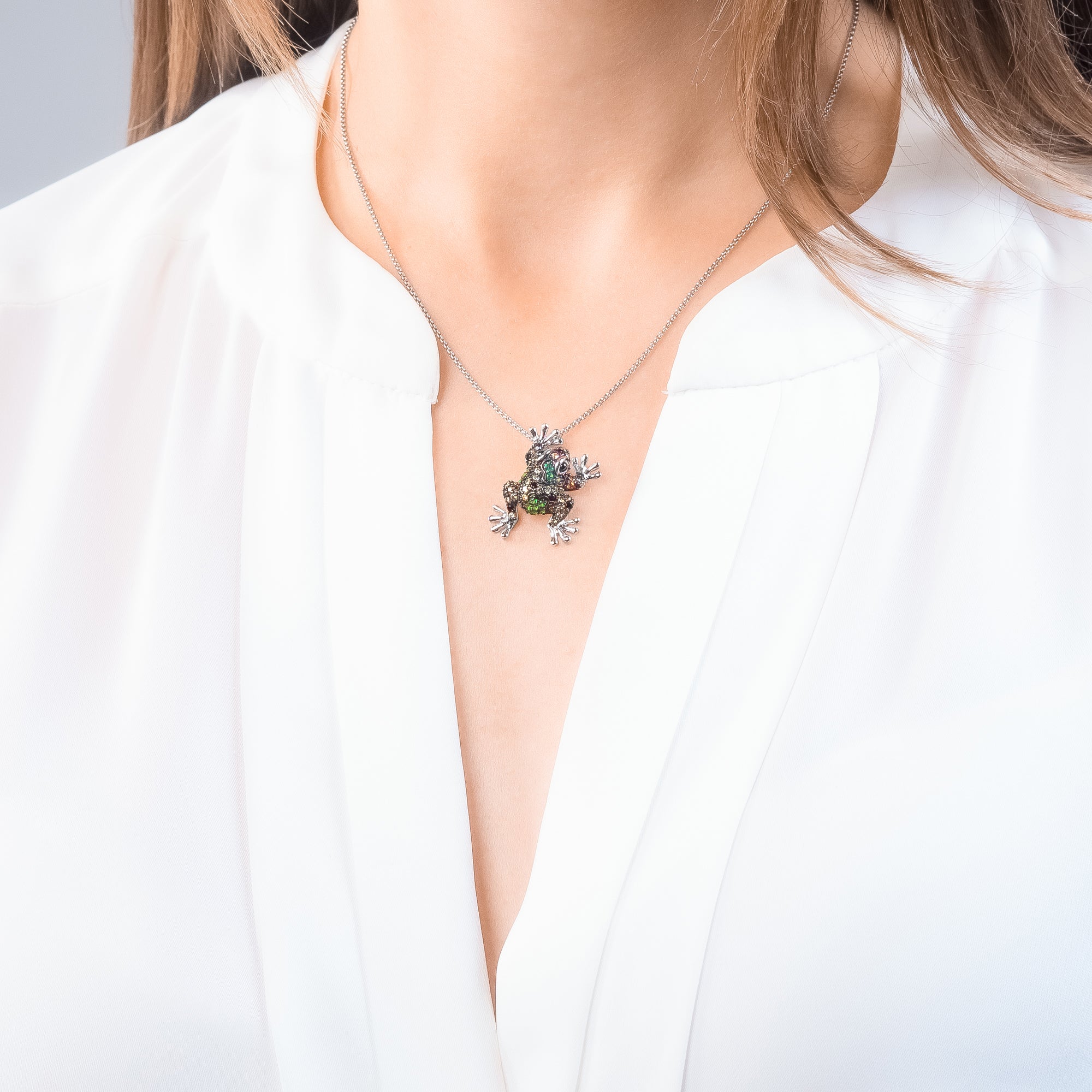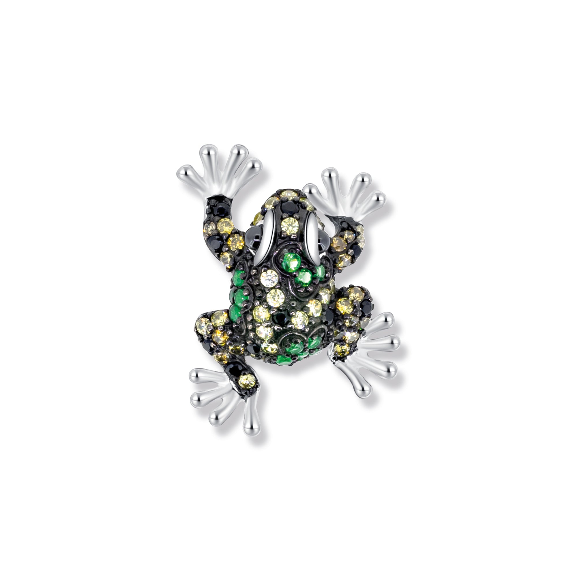 Unser Joey Frosch Anhänger aus hochwertigem 925 Sterling Silber ist eine charmante Verbindung zur Natur. Die zweifarbig angeordneten grünen und braunen Zirkonia-Steine funkeln auf geschwärztem Hintergrund und strahlen zeitlose Eleganz aus.