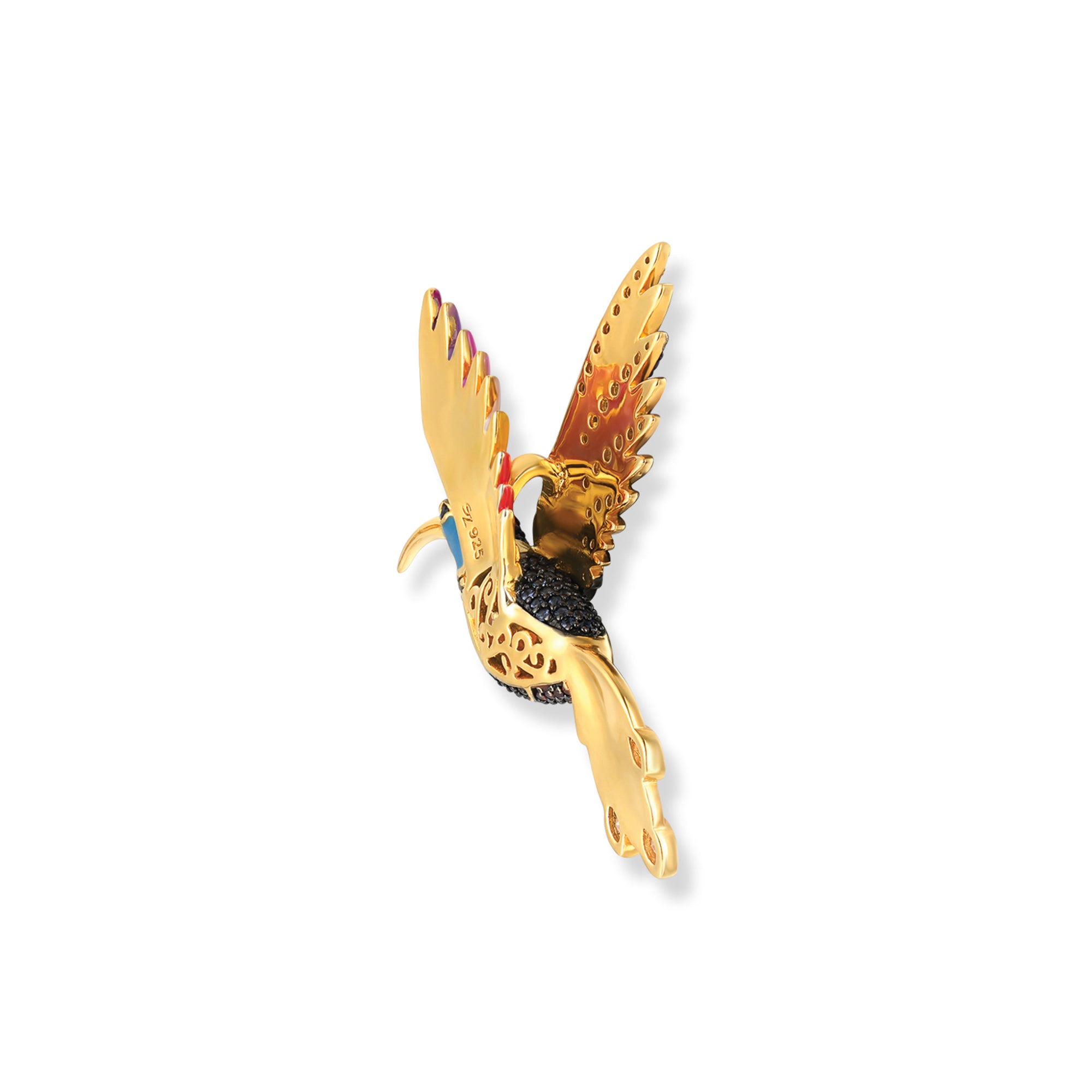 Cleo Kolibri Anhänger ist ein wahres Farbenwunder! Gefertigt aus 925er Silber und 18k vergoldet, zeigt dieser fliegende Kolibri eine fröhliche Darstellung. Bunte Zirkonia und ein regenbogenähnliches Farbspektakel an den Federn machen diesen Anhänger zum perfekten Begleiter für alle, die gerne mit Stil und einer Prise Humor auffallen.