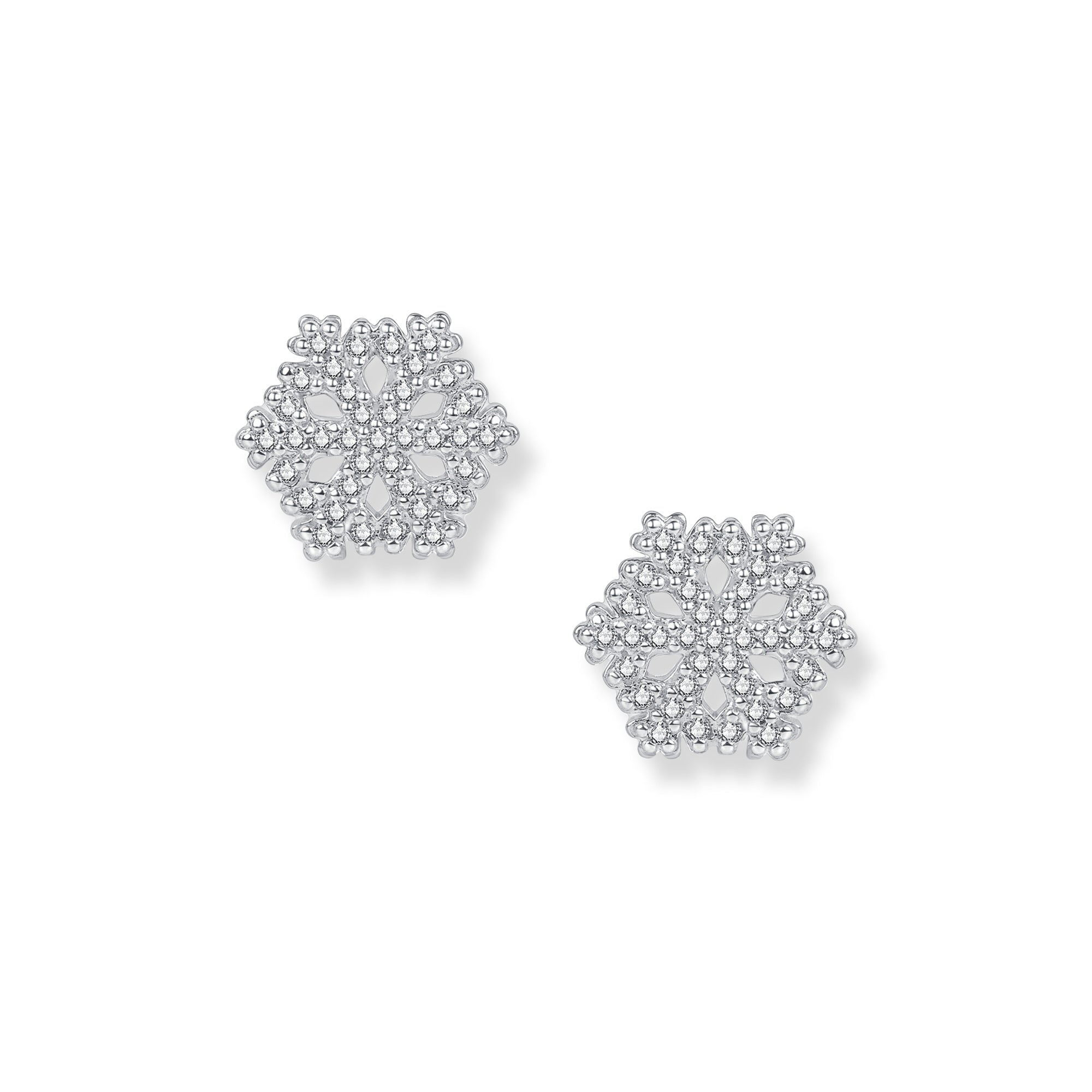 Unsere Flake Schneeflocken Ohrringe aus rhodiniertem 925 Sterling Silber sind mit funkelnden weißen Zirkonia Steinen verziert, die die Anmut und Faszination einer Schneeflocke einfangen.