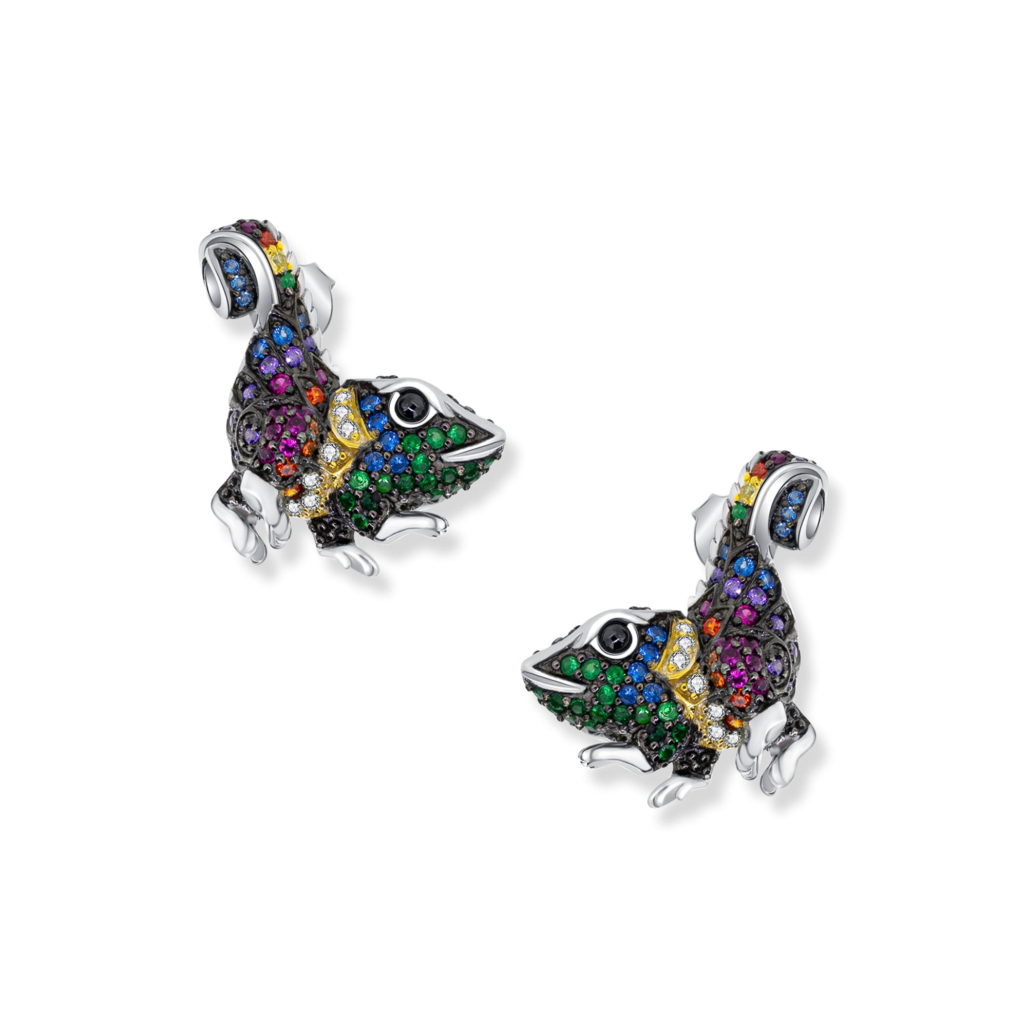 Die Theo Chamäleon Ohrringe aus 925 Sterling Silber sind ein Fest der Farben. Rhodiniert, geschwärzt und vergoldet, schmücken funkelnde Zirkonia Steine in verschiedenen Farben diese eleganten Ohrringe.
