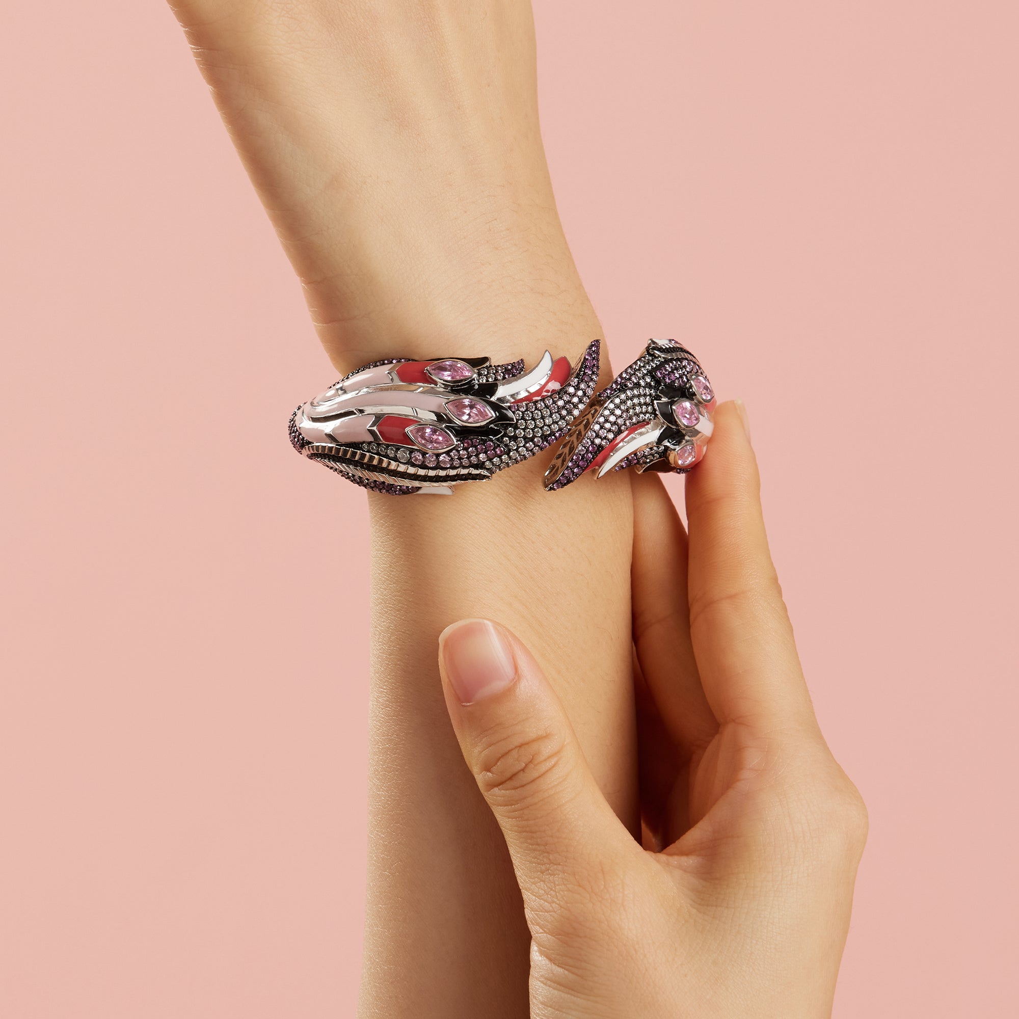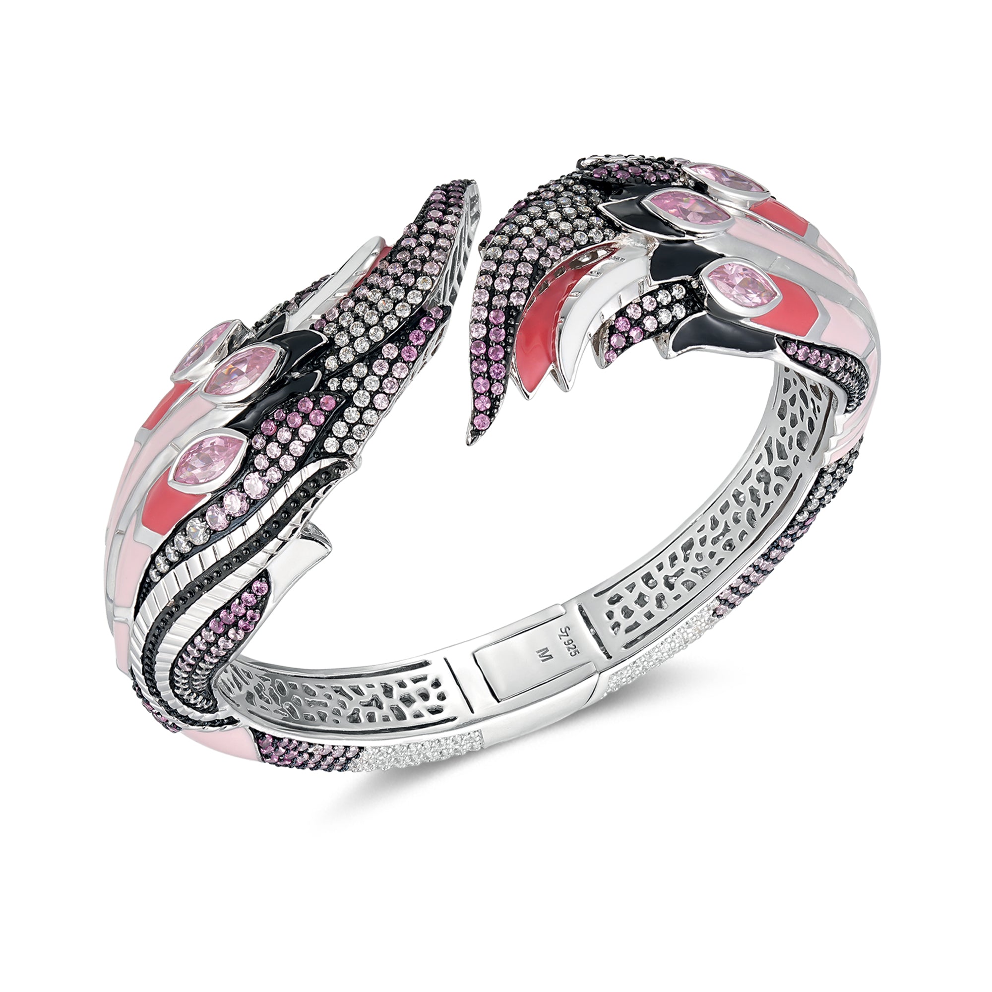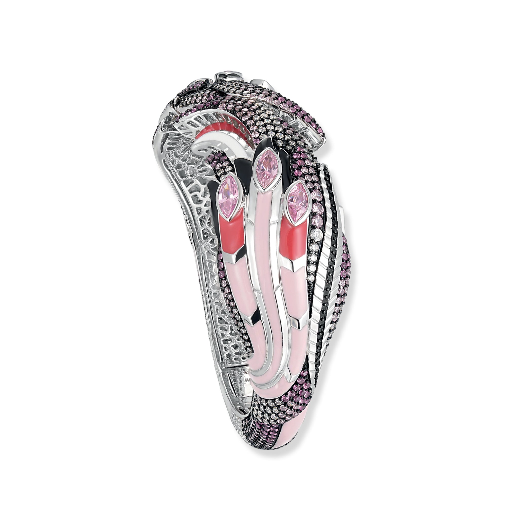 Die rhodinierte Fabio Flamingo Armspange ist das elegante Pendant zur vergoldeten Fiola Flamingo Armspange. Gefertigt aus Silber 925 und rhodiniert, präsentiert sich diese Armspange in einer offenen, federartigen Form des Flamingos. Mit schwarzer und Fuchsia Emaille sowie Pink und weißen Zirkonia verleiht sie Ihrem Handgelenk eine bezaubernde und stilvolle Ausstrahlung.