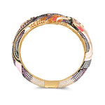 Die Fiola Flamingo Armspange ist das Statement der neuen Kollektion – üppig, detailreich und vergoldet aus Silber 925. Die Form der Spange spiegelt das prächtige Gefieder des Flamingos wider, mit rosa und schwarzen Emaille-Texturen sowie rosa und weißen Zirkonia, die von beiden Seiten des Handgelenks hervorstechen.