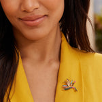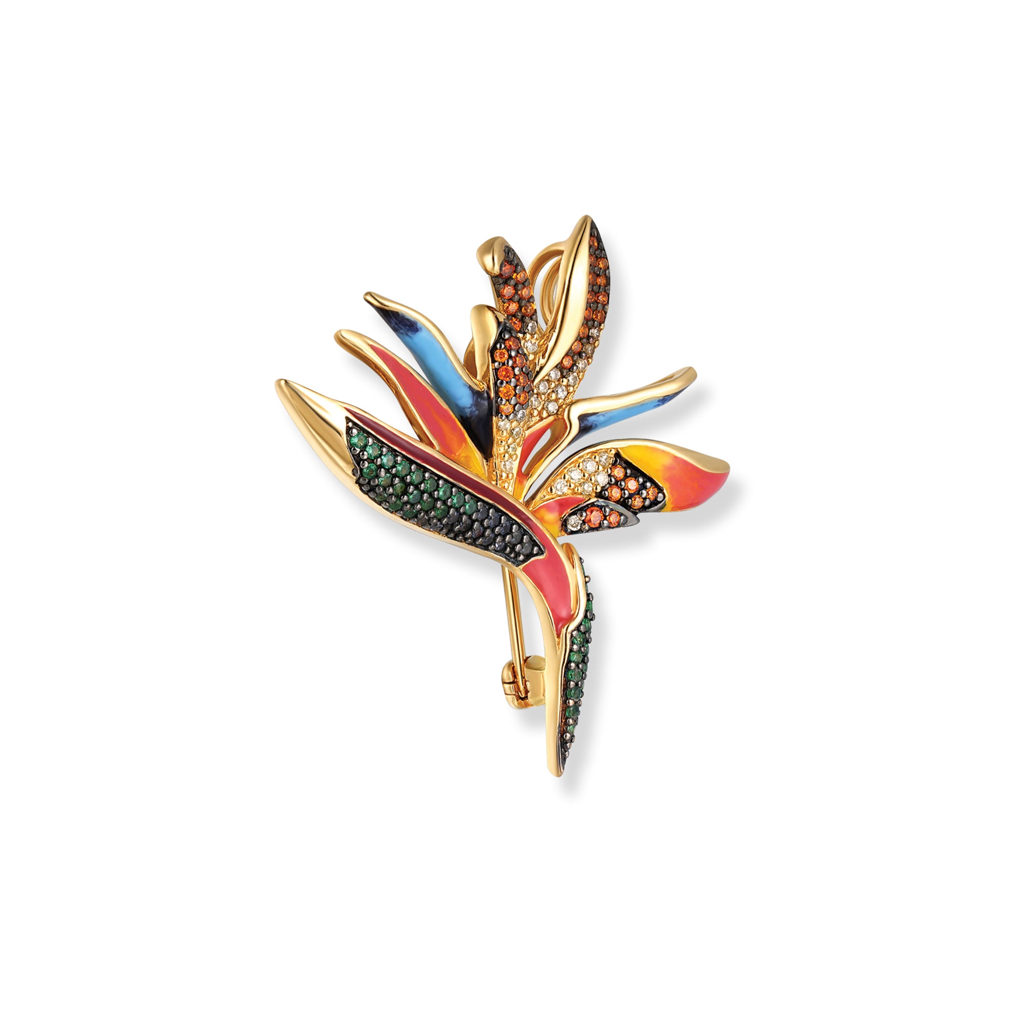 Der farbenfrohe Paradies Blumen Anhänger/Brosche, mit lebendigen Emaille-Details, funkelnden Zirkonia und vergoldeten Akzenten, strahlt in edlem 925'er Silber pure Lebensfreude aus.
