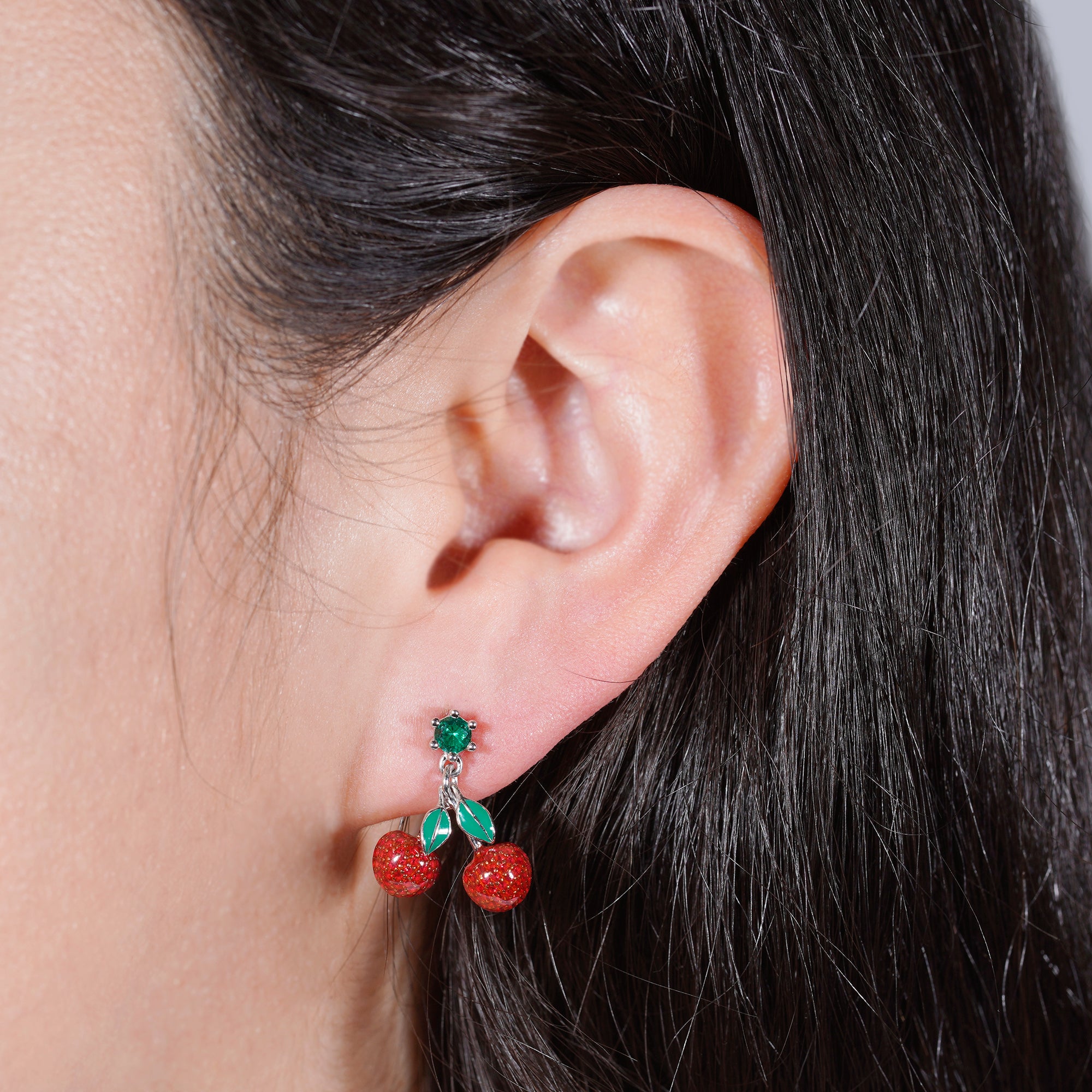 Die Kiri Kirschen Ohrringe sind bezaubernde Schmuckstücke aus rhodiniertem 925 Sterling Silber. Mit grüner Emaille an den Blättern und funkelnden roten Zirkonia Steinen an der Frucht verleihen sie jedem Outfit einen frischen und harmonischen Touch.