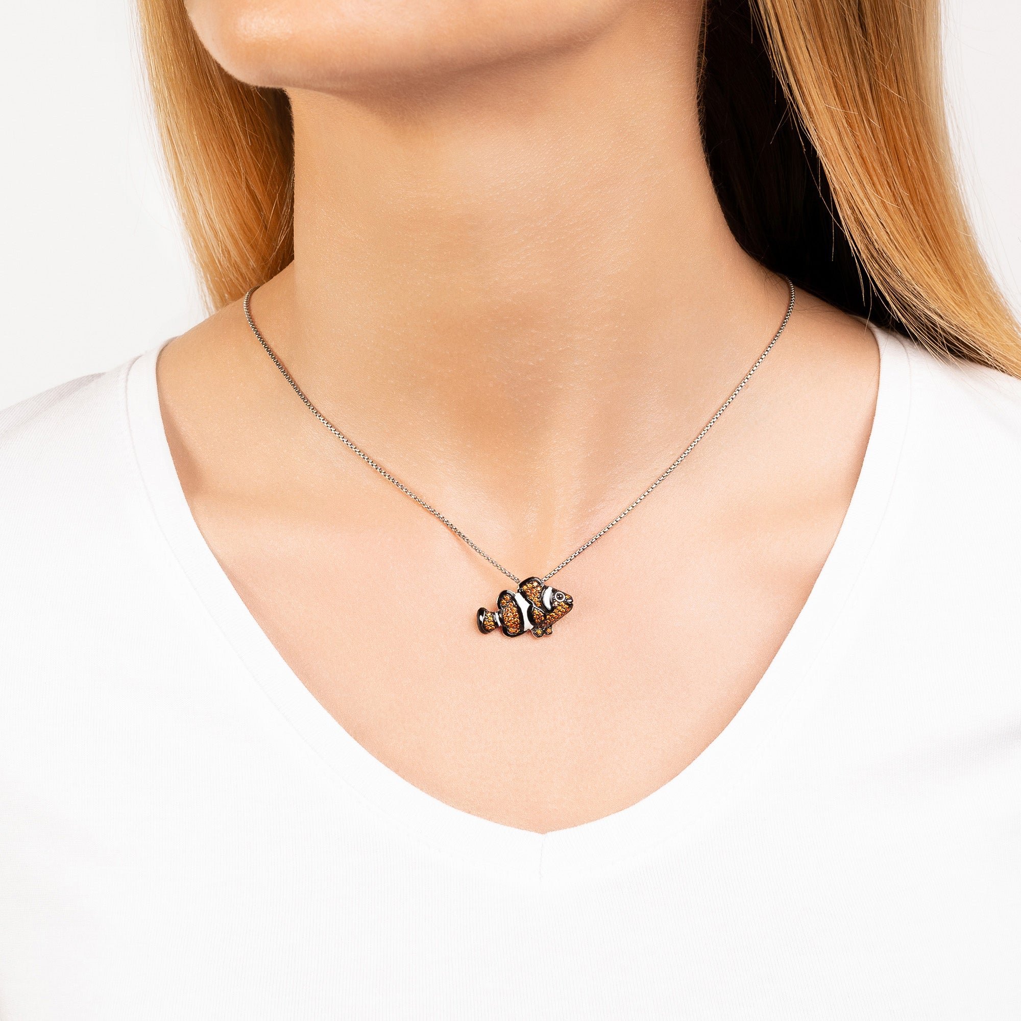 Der Cora Fisch Anhänger in 925 Sterling Silber ist mit farbenfroher Emaille und schillernden Zirkonia Steinen in einem faszinierenden Mix aus Schwarz und Orange verziert.