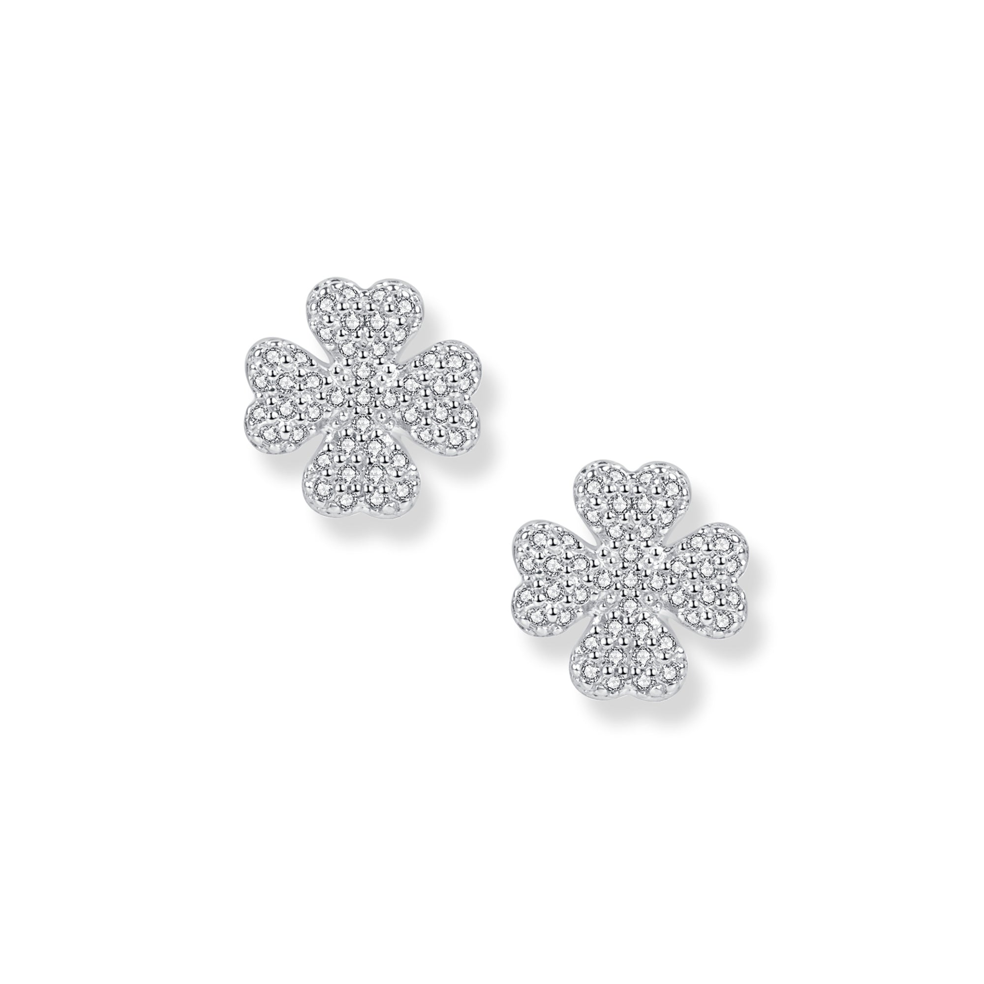 Unsere Clover Kleeblatt Ohrringe aus rhodiniertem 925 Sterling Silber sind mit funkelnden weißen Zirkonia Steinen verziert, die Glück und Eleganz verkörpern.