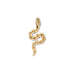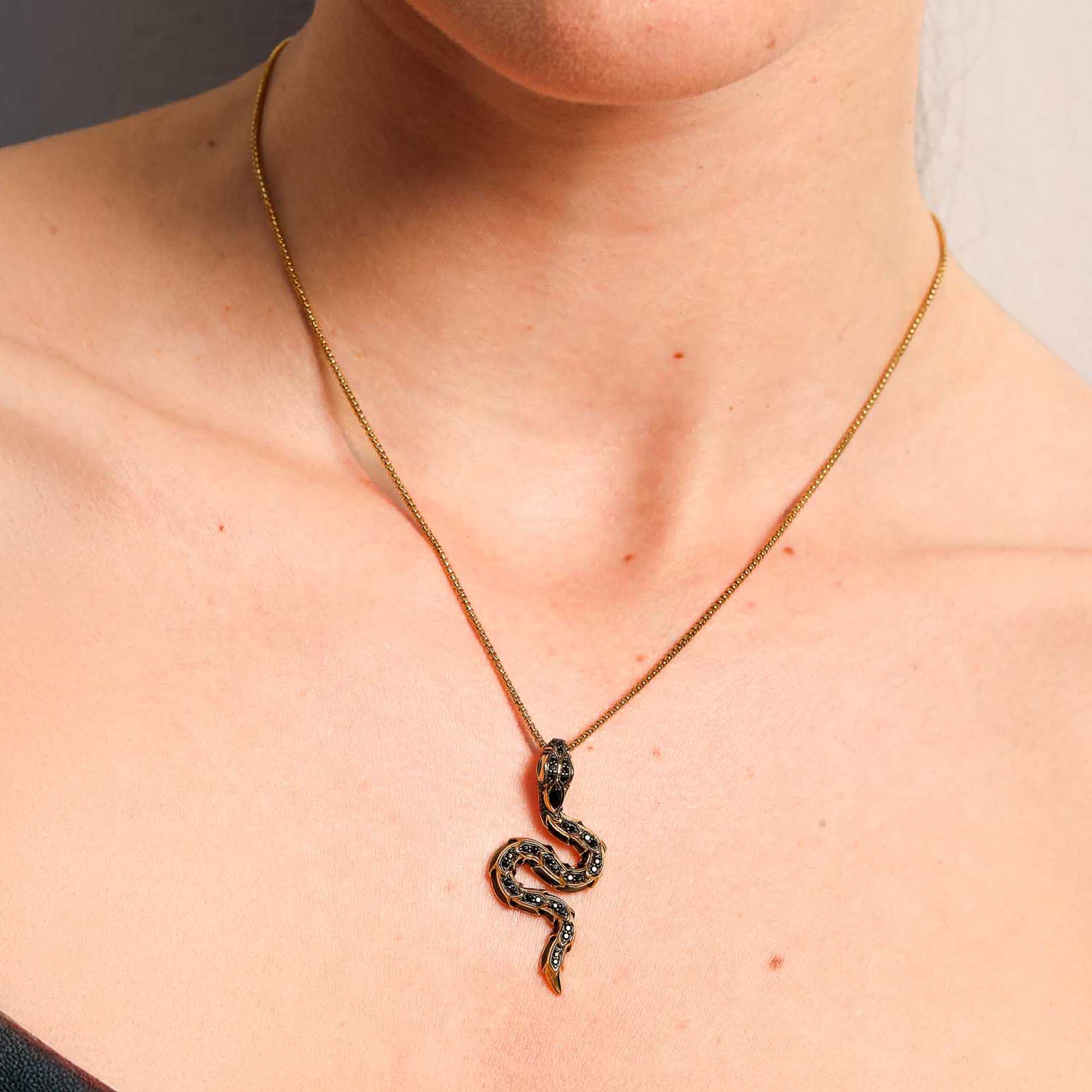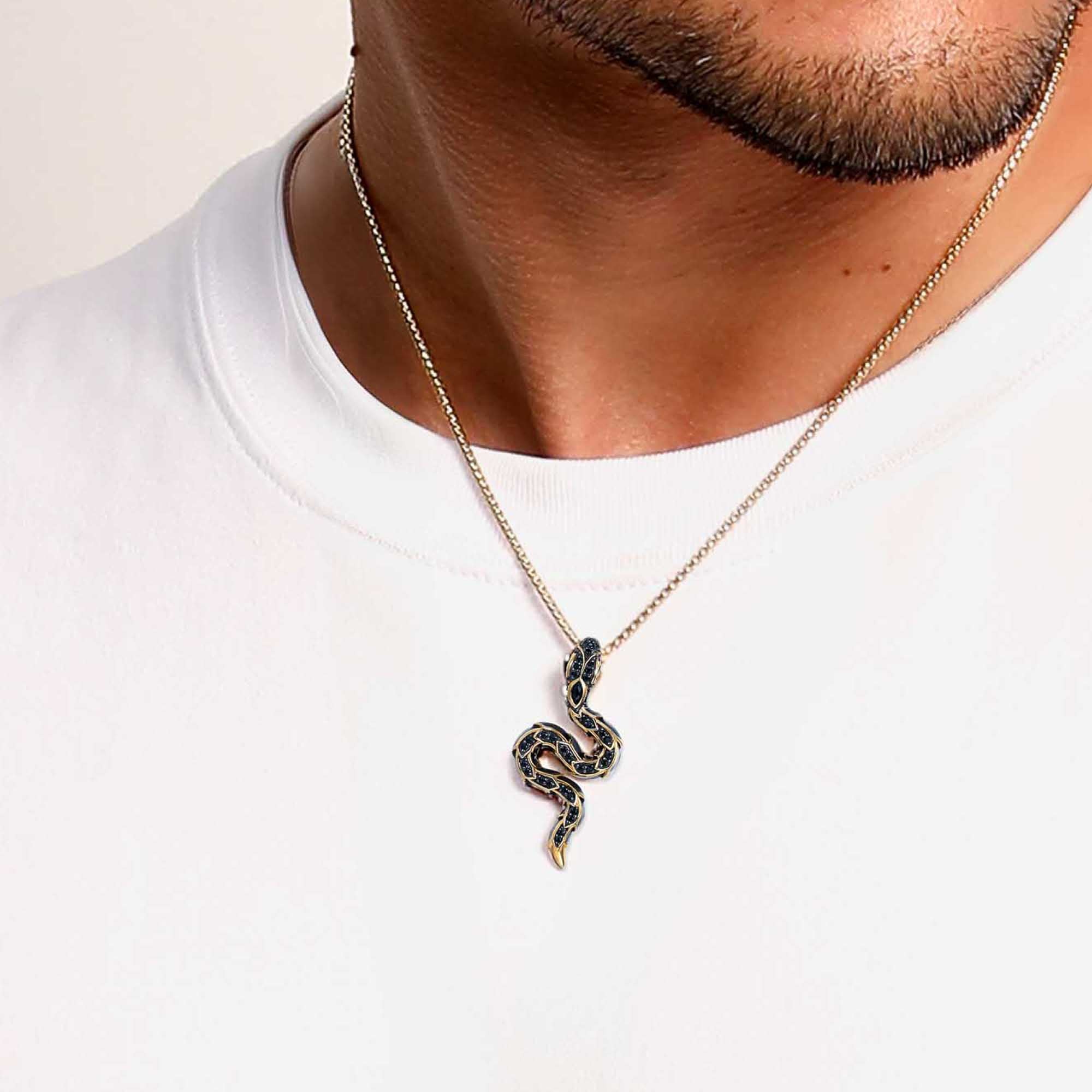 Der Fangor Schlangen Anhänger aus 18k vergoldetem Sterling Silber mit smaragdgrünen Zirkonia-Augen, schwarzen Zirkonia und drachenschuppenartigen Texturen ist ein mystisches und luxuriöses Unisex-Schmuckstück aus der SEINERZEIT Noctis Kollektion.