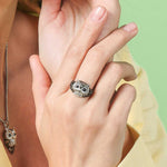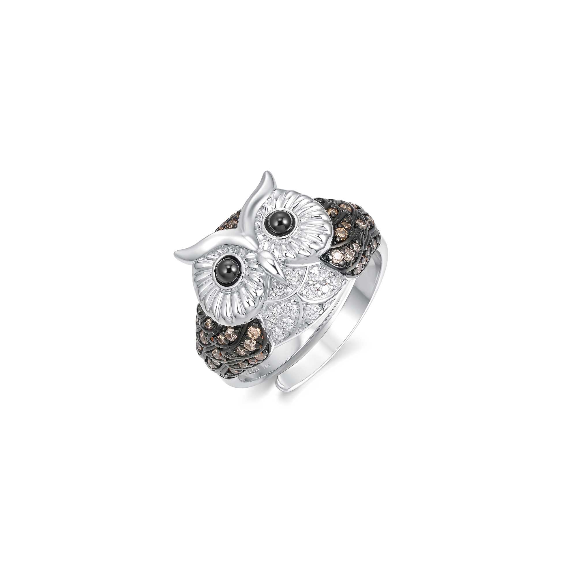Der Merlin Eulen Ring aus Sterling Silber mit champagnerfarbenen Zirkonia und offener Ringschiene für individuelle Größenanpassung vereint Eleganz und Symbolik in einem vielseitigen Schmuckstück. Perfekt als Ergänzung zur Merlin Eulen Kollektion.