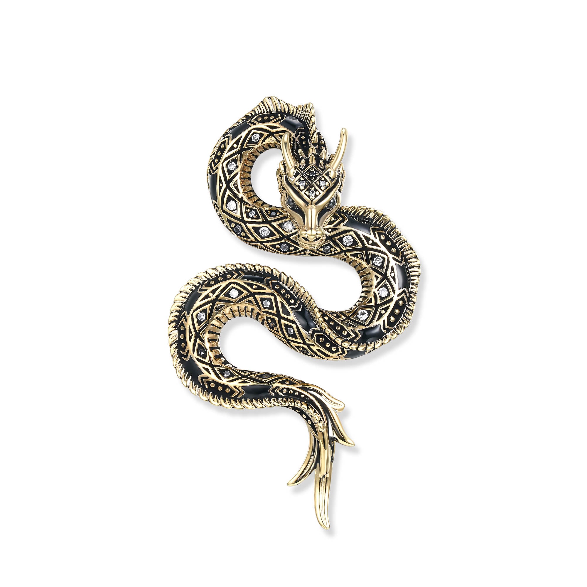 Der Belarius Drachen Anhänger aus 18k vergoldetem Sterling Silber mit funkelnden schwarzen Zirkonia vereint kraftvolle Eleganz und Mystik in einem Unisex Design aus der SEINERZEIT Noctis Kollektion.