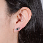 Die Betty Fledermaus Ohrringe setzen auf subtile Eleganz. Zarte Stecker mit filigranen Flügeln, verziert mit schwarz-grauer Emaille. Der Körper wird von einem einzigen schwarzen Zirkonia verziert – ein kleiner Held der Dunkelheit.