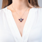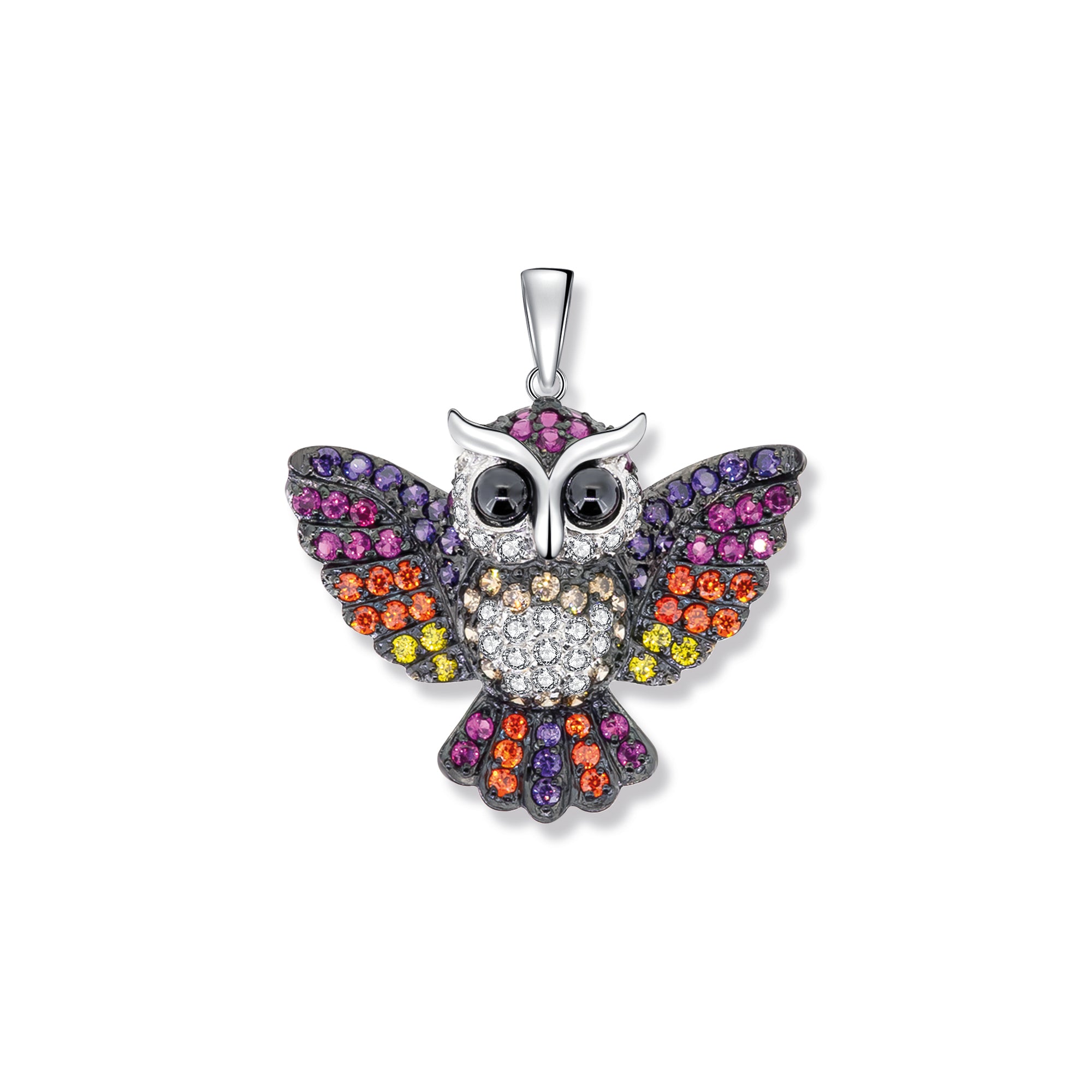 Der Helga Eulen Anhänger aus 925 Sterling Silber mit geöffneten Flügeln strahlt mit funkelnden Zirkonia-Steinen in lebendigem Lila und bunten Farben einen Hauch von Freiheit und Eleganz aus.