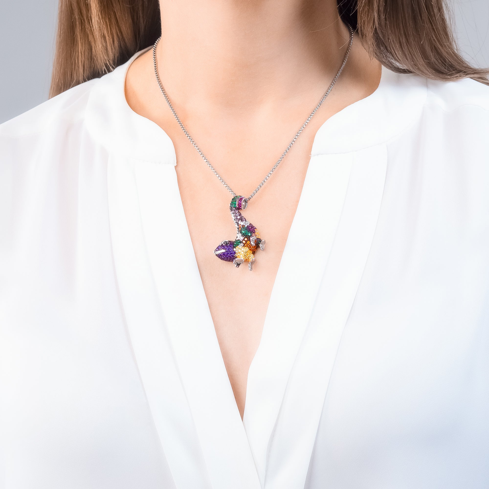 Der Moritz Chamäleon Anhänger in 925 Sterling Silber ist ein Meisterwerk aus Vielfalt und Glanz. Rhodiniert, geschwärzt und vergoldet, verzaubert dieser Anhänger mit seinen funkelnden Zirkonia Steinen in einem lebendigen Lila-Ton und hängt stilvoll herab.