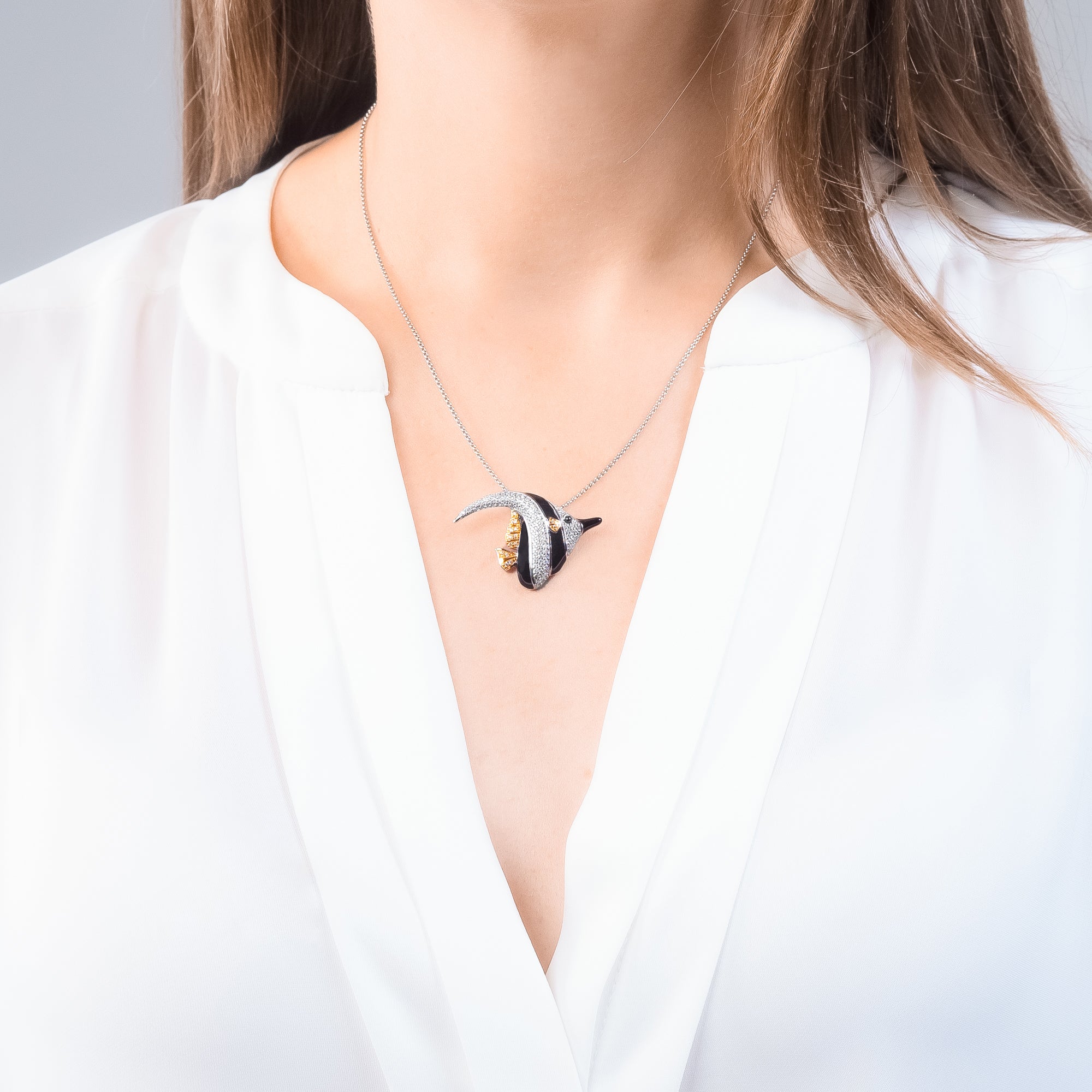 Der Ozy Fisch Anhänger ist eine Hommage an die Schönheit des Ozeans. Hergestellt aus erstklassigem 925 Sterling Silber, ist der Anhänger mit Emaille, rhodiniert, geschwärzt und vergoldet. Die funkelnden Zirkonia Steine in Schwarz und Weiß verleihen diesem Schmuckstück eine unvergleichliche Brillanz.