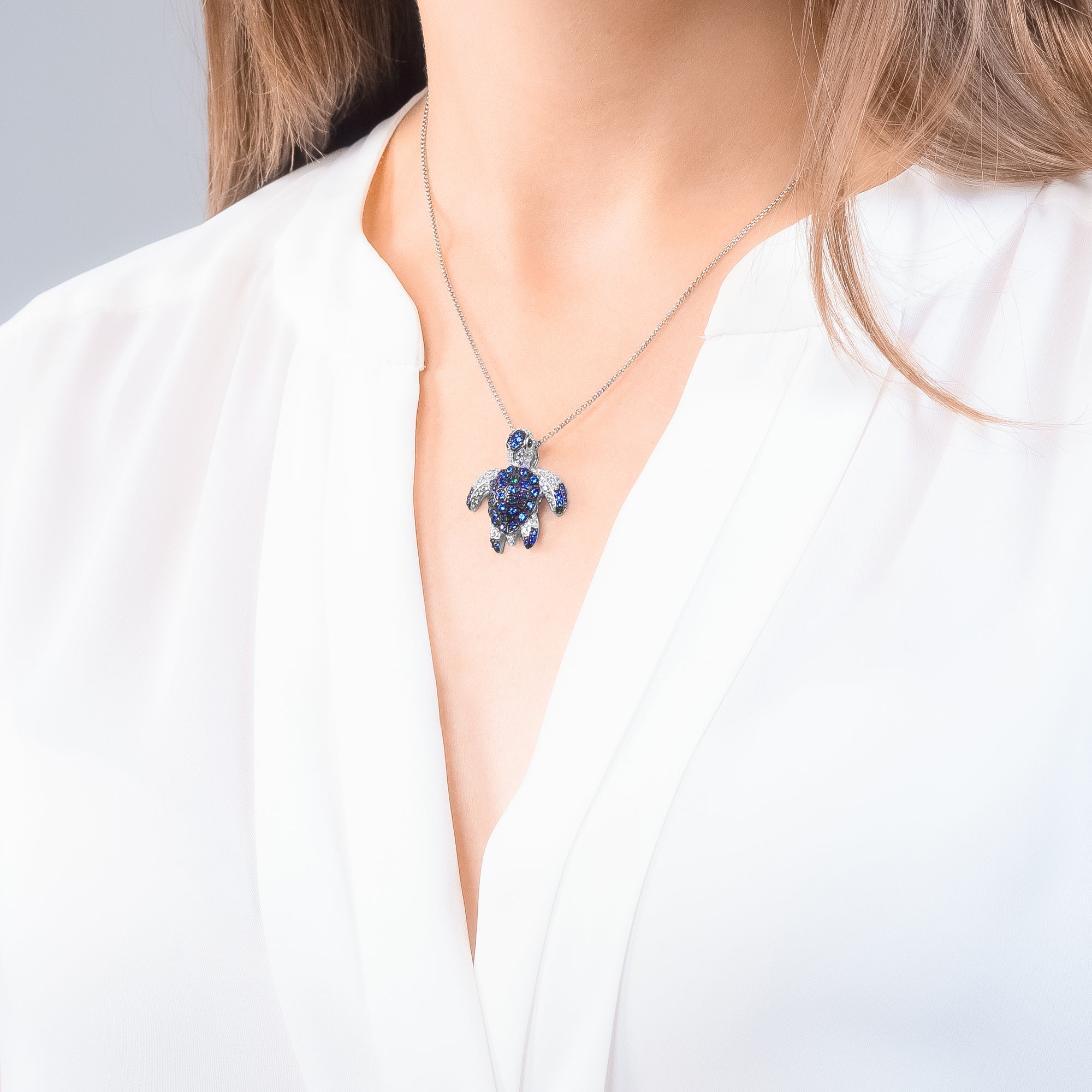 Der Schelly Schildkröten Anhänger in 925 Sterling Silber ist eine zauberhafte Hommage an die Schönheit der Ozeane. Mit einem kunstvollen Design aus rhodiniertem und geschwärztem Silber sowie blauen und weißen Zirkonia Steinen ist dieser Anhänger ein Symbol für Eleganz und Naturliebe.