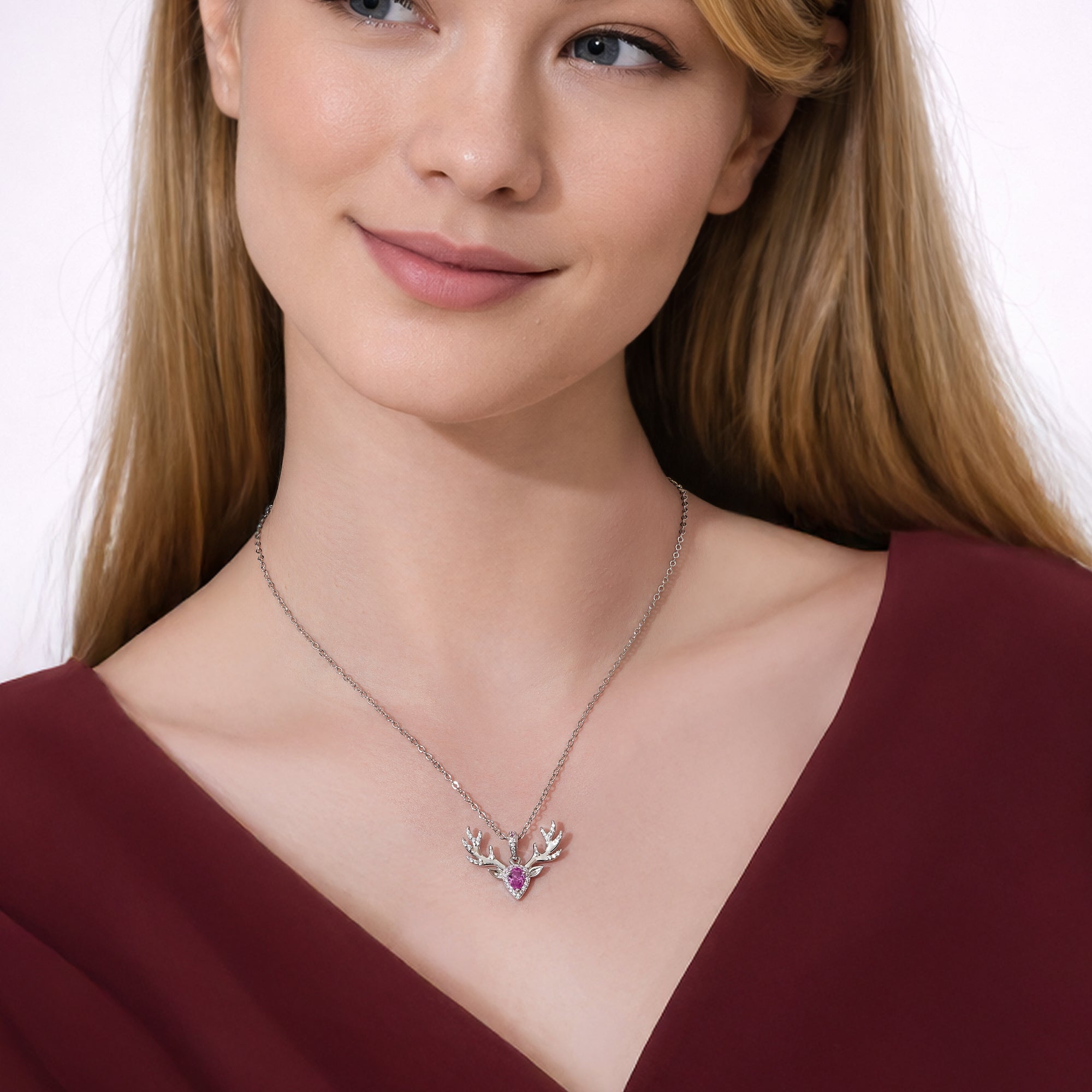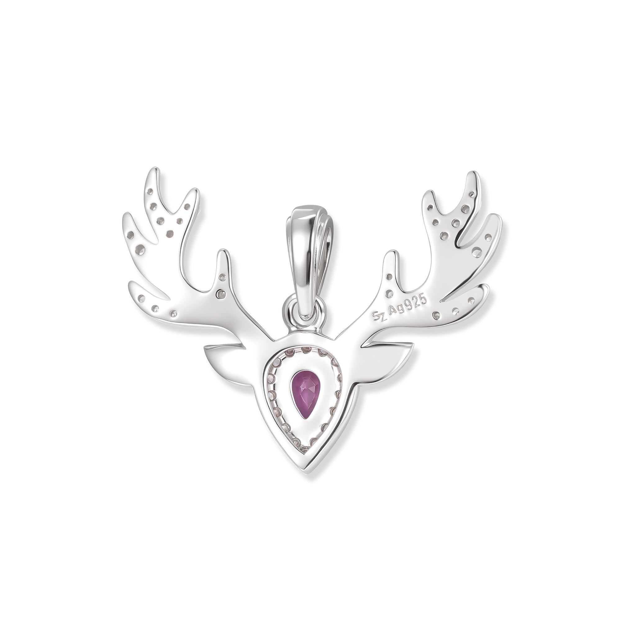 Silberner Freja Hirsch Anhänger aus der DREAM Serie mit abstraktem Hirschkopf, verzweigtem Geweih und tropfenförmigem pinkfarbenem Zirkonia im Zentrum