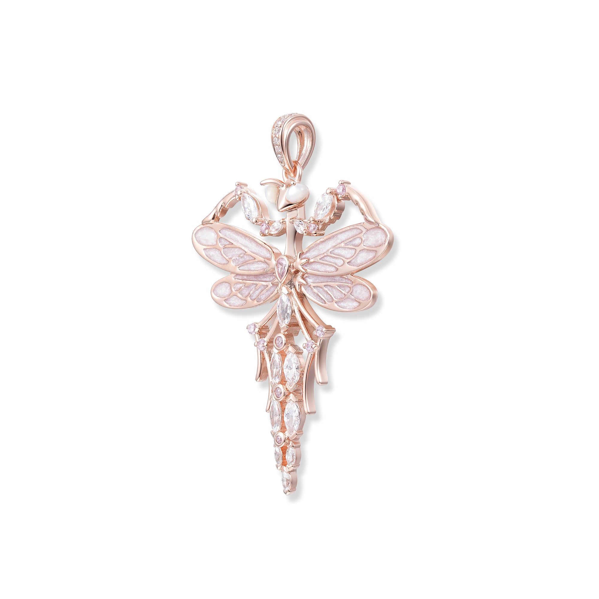 Juliette – zart, harmonisch und voller Anmut. Ein eleganter Gottesanbeterin Anhänger in Roségold, mit schimmernder Emaille und funkelnden Zirkonia. SEINERZEIT Waldleben.