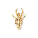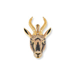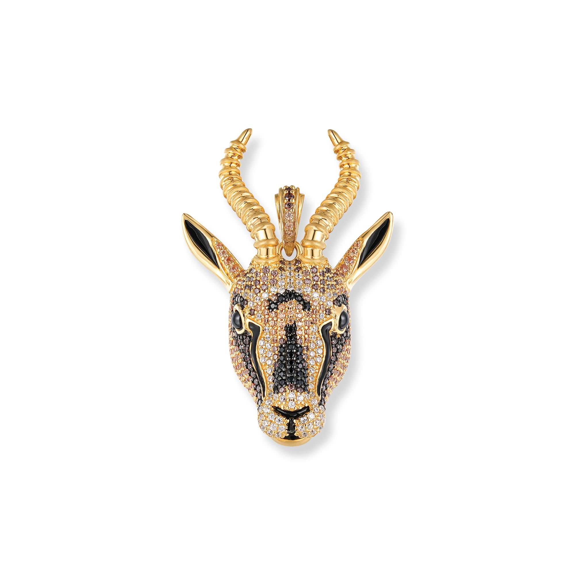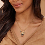 Zena Gazellen Anhänger strahlt in 18k vergoldetem Silber 925 eine einzigartige Eleganz aus. Der Gazellenkopf ist mit funkelnden champagnerfarbenen Zirkonia besetzt, während schwarze Emaille entlang des Auges eine subtile und raffinierte Verzierung bildet.